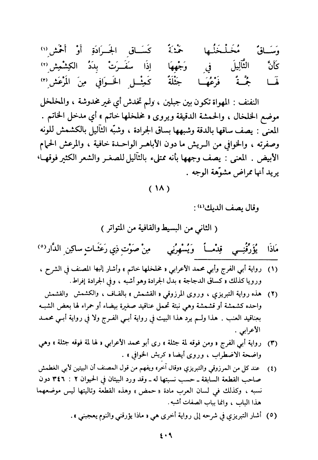 المعنى: يصف ساقها بالدقة وشبهها بساق الجرادة، وشبه الثآليل بالكشمش للونه وصفرته، والخوافي من الريش ما دون الأباهر الواحدة خافية، والمرعش الحمام الأبيض. المعنى: يصف وجهها بأنه ممتليء بالثآليل للصغر والشعر الكثير فوقها، يريد أنه ممراض مشوهة الوجه.