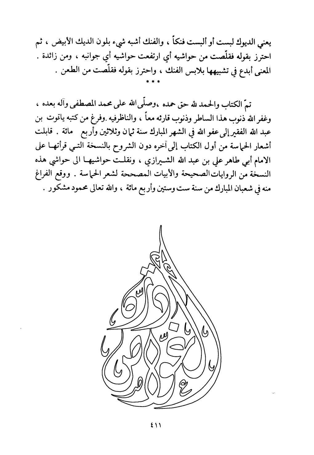 تم الكتاب والحمد لله حق حمده، وصلى الله على محمد المصطفى وآله بعده، وغفر الله ذنوب هذا الساطر وذنوب قارئه معاً، والناظر فيه. وفرغ من كتبه ياقوت بن عبد الله الفقير إلى عفو الله في الشهر المبارك سنة ثمان وثلاثين وأربع مائه. قابلت أشعار الحماسة من أول الكتاب إلى آخره دون الشروح بالنسخة التي قرأتها على الإمام أبي طاهر علي بن عبد الله الشيرازي، ونقلت حواشيها إلى حواشي هذه النسخة من الروايات الصحيحة والأبيات المصححة لشعر الحماسة. ووقع الفراغ منه في شعبان المبارك من سنة ست وستين وأربع مائة، والله تعالى محمود مشكور.