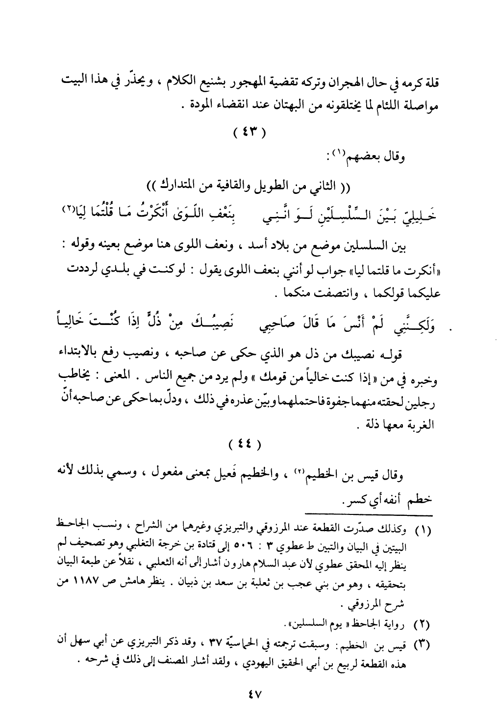 قوله نصيبك من ذل هو الذي حكي عن صاحبه, ونصيب رفع بالابتداء وخبره في من ((إذا كنت خاليًا من قومك)) ولم يرد من جميع الناس. المعنى: يخاطب رجلين لحقته منهما جفوة فاحتملهما وبين عذره في ذلك, ودل بما حكي عن صاحبه أن الغربة معها ذلة.