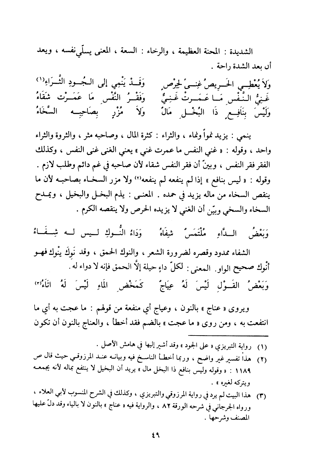 ينمي: يزيد نموًا ونماء، والثراء: كثرة المال، وصاحبه مثر، والثروة والثراء واحد، وقوله: "غني النفس ما عمرت غنى" يعني الغنى غنى النفس، وكذلك الفقر فقر النفس، وبين أن فقر النفس شقاء لأن صاحبه في غم دائم وطلب لازم. وقوله: "ليس بنافع" إذا لم ينفعه ولا مزر السخاء بصاحبه لأن ما ينقص السخاء من ماله يزيد في حمده. المعنى: يذم البخل والبخيل، ويمدح السخاء والسخي من ماله يزيد في حمده. المعنى: يذم البخل والبخيل، ويمدح السخاء والسخي وبين أن الغني لا يزيده الحرص ولا ينقصه الكرم.