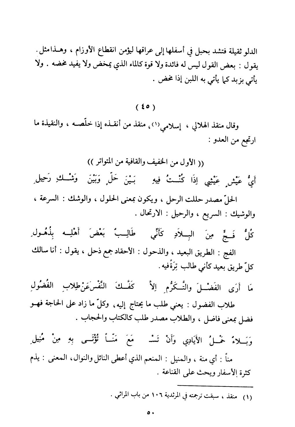 منًا: أي منة، والمنيل: المنعم الذي أعطى النائل والنوال، المعنى: يذم كثرة الأسفار ويحث على القناعة.