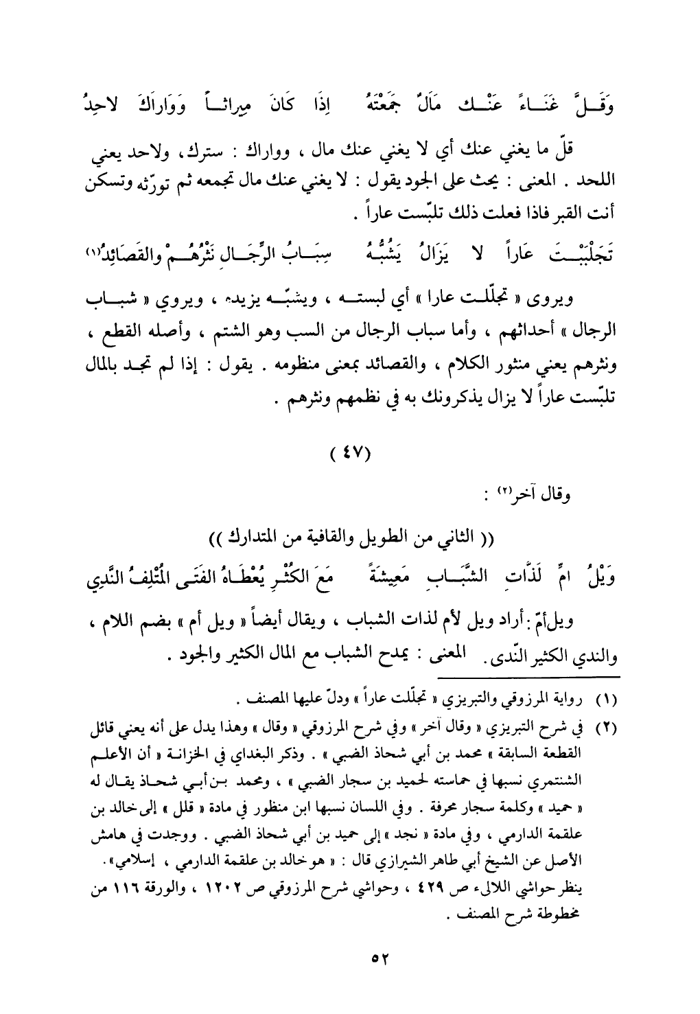 ويروى "تجللت عارا" أي لبسته، ويشبه يزيده، ويروي "شباب الرجال" أحداثهم، وأما سباب الرجال من السب وهو الشتم، وأصله القطع، ونثرهم يعني منثور الكلام، والقصائد بمعنى منظومه. يقول: إذا لم تجد بالمال تلبست عارًا لا يزال يذكرونك به في نظمهم ونثرهم.