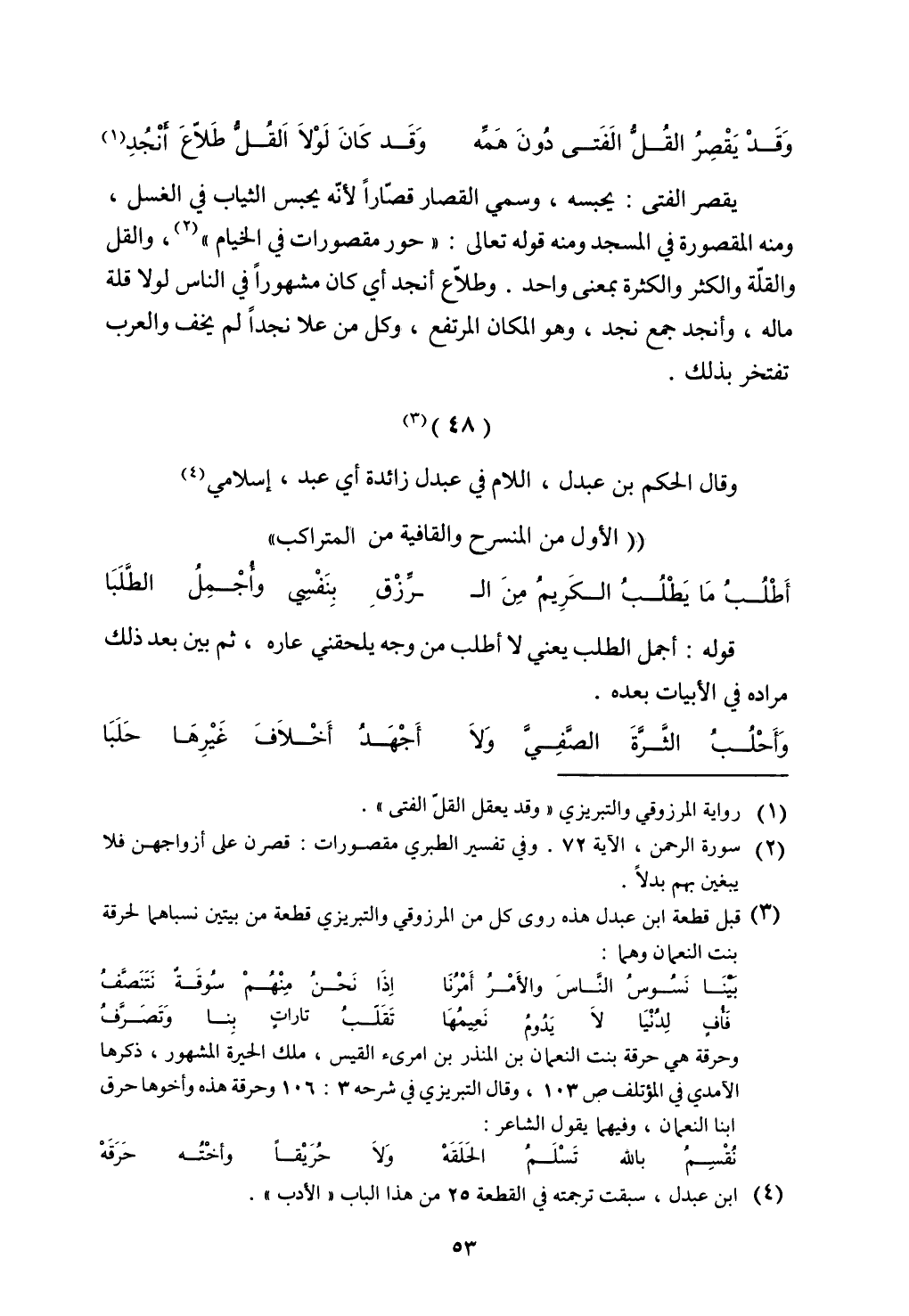 يقصر الفتى: يحبسه، وسمي القصار قصارًا لأنه يحبس الثياب في الغسل، ومنه المقصورة في المسجد ومنه قوله تعالى: "حور مقصورات في الخيام"، والقل والقلة والكثر والكثرة بمعنى واحد. وطلاع أنجد أي كان مشهورًا في الناس لولا قلة ماله، وأنجد جمع نجد، وهو المكان المرتفع، وكل من علا نجدًا لم يخف والعرب تفتخر بذلك.