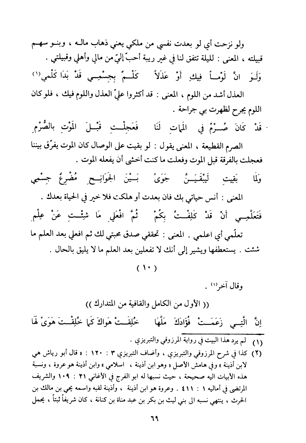 ولو نزحت أي لو بعدت نفسي من ملكي يعني ذهاب ماله، وبنو سهم قبيلته، المعنى: لليلة تتفق لنا في غير ريبة أحب إلي من مالي وأهلي وقبيلتي.