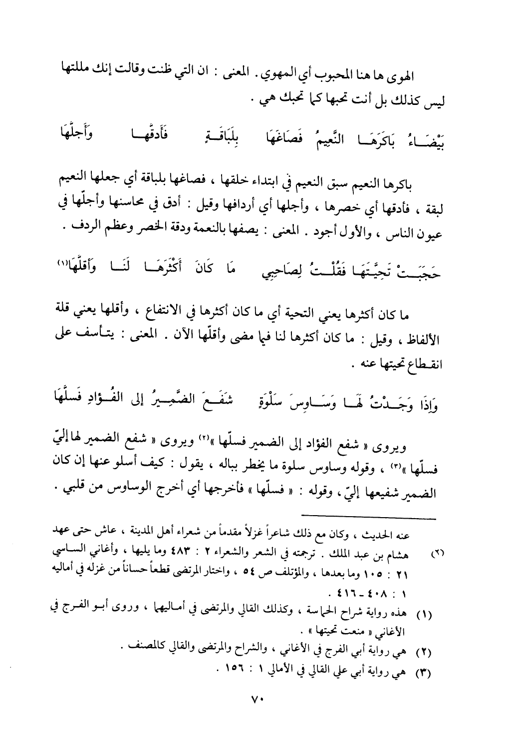 ويروي "شفع الفؤاد إلى الضمير فسلها" ويروي "شفع الضمير لها إلي فسلها"، وقوله وساوس سلوة ما يخطر بباله، يقول: كيف أسلو عنها إن كان الضمير شفيعها إلي، وقوله: "فسلها" فأخرجها أي أخرج الوساوس من قلبي.