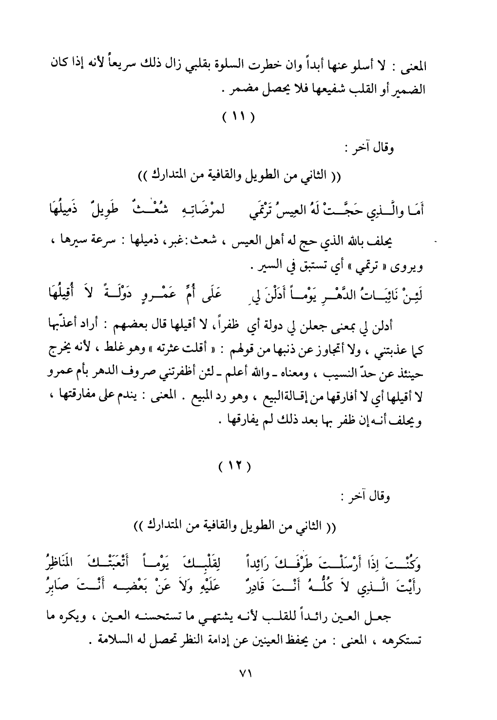 أدلن لي بمعنى جعلن لي دولة أي ظفرًا، لا أقيلها قال بعضهم: أراد أعذبها كما عذبتني، ولا أتجاوز عن ذنبها من قولهم: "أقلت عثرته" وهو غلط، لأنه يخرج حينئذ عن حد النسيب، ومعناه- والله أعلم- لئن أظفرتني صروف الدهر بأم عمرو لا أقيلها أي لا أفارقها من إقالة البيع، وهو رد المبيع. المعنى: يندم على مفارقتها، ويحلف أنه إن ظفر بها بعد ذلك لم يفارقها.