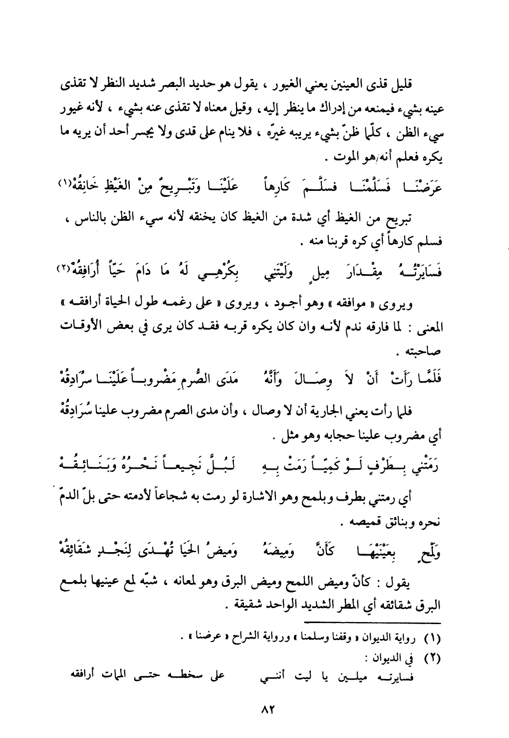 ويروي "موافقه "وهو أجود، ويروي "على رغمه طول الحياة أرافقه "المعنى: لما فارقه ندم لأنه وإن كان يكره قربه فقد كان يرى في بعض الأوقات صاحبته.