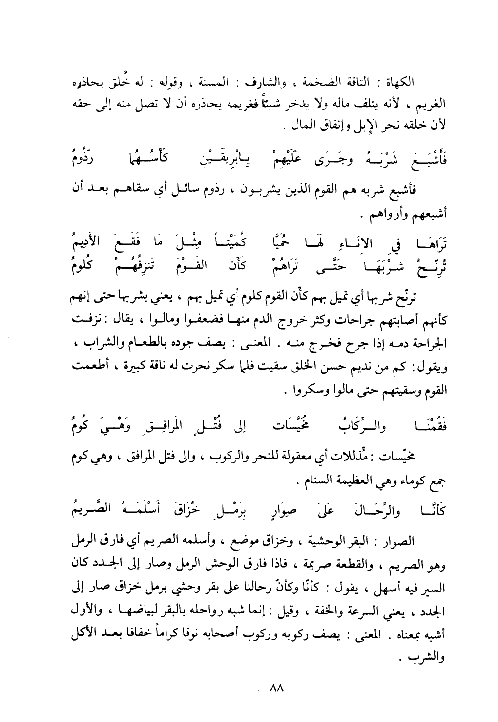 الكهاة: الناقة الضخمة، والشارف: المسنة، وقوله: له خلق يحاذره الغريم، لأنه يتلف ماله ولا يدخر شيئًا فغريمه يحاذره أن لا تصل منه إلى حقه لأن خلقه نحر الإبل وإنفاق المال.