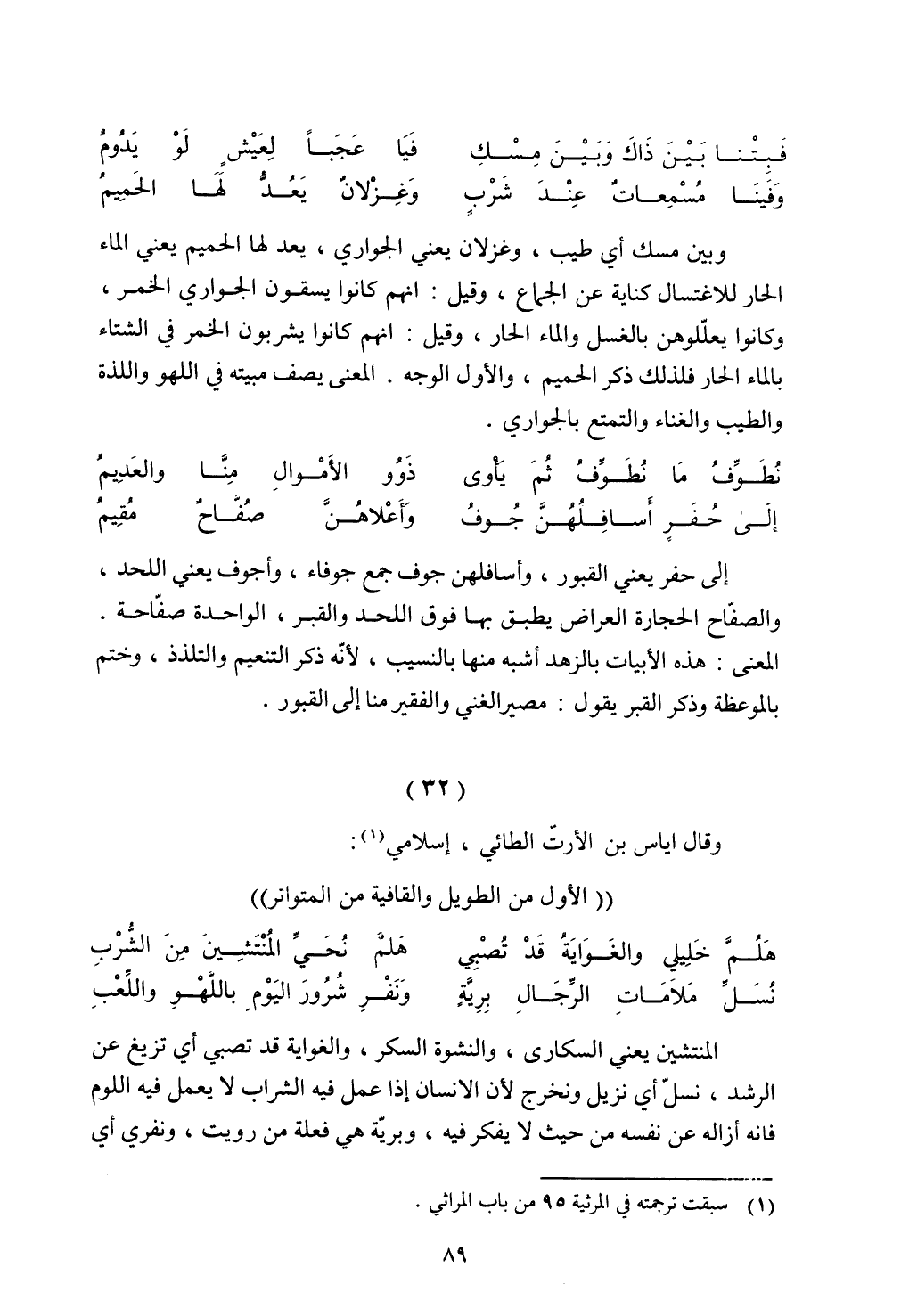 المعنى: هذه الأبيات بالزهد أشبه منها بالنسيب, لأنه ذكر التنعيم والتلذذ, وختم بالموعظة وذكر القبر يقول: مصير الغني والفقير منا إلى القبور.