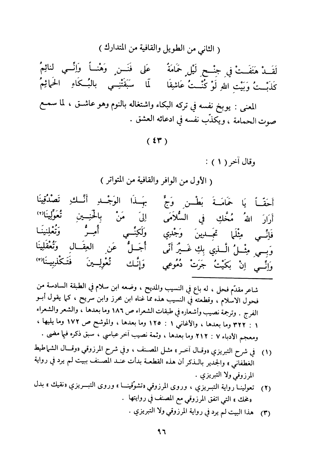 لقَد هتفَت في جنْح ليْل حمامَة ... على فنَن وهنا وانِّي لنائِم
