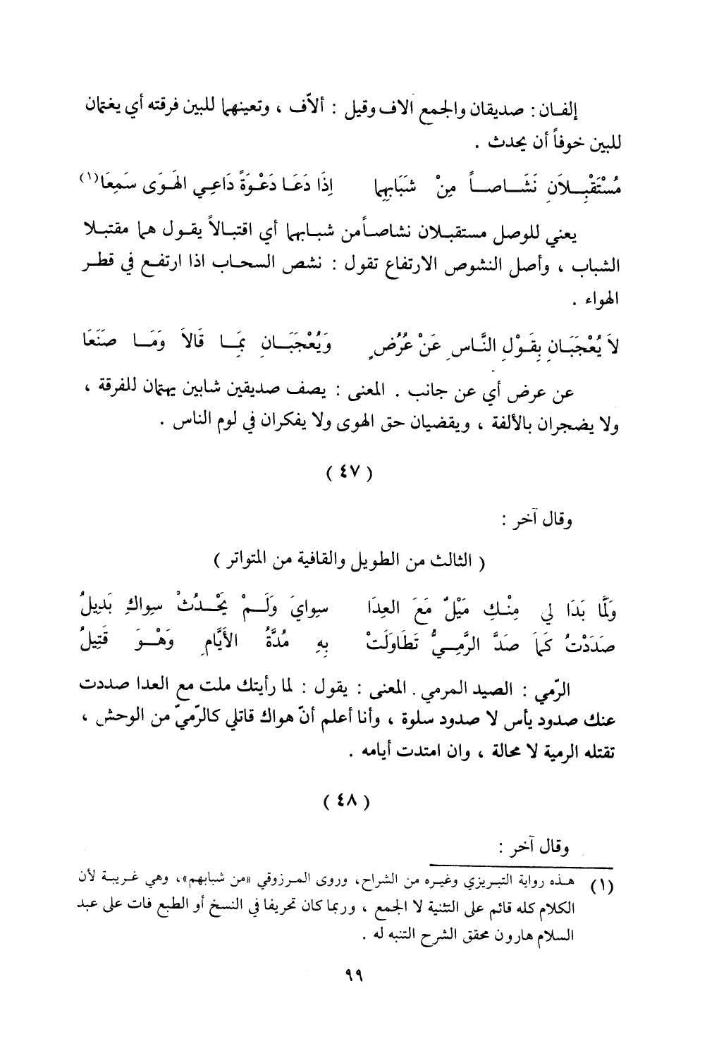 عن عرض أي عن جانب، المعنى: يصف صديقين شابين يهتمان للفرقة، ولا يضجران بالألفة، ويقضيان حق الهوى ولا يفكران في لوم الناس.