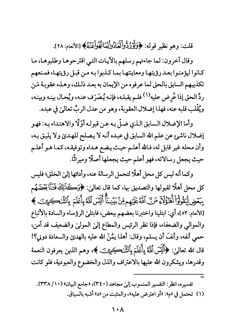 وأما الإضلال السابق الذي ضلّ به عن قبوله أوّلًا والاهتداء به: فهو إضلال ناشئ عن علم الله السابق في عبده أنه لا يصلح للهدى ولا يليق به، وأن محله غير قابل له، فالله أعلم حيث يضع هداه وتوفيقه، كما هو أعلم حيث يجعل رسالاته، فهو أعلم حيث يجعلها أصلًا وميراثًا.