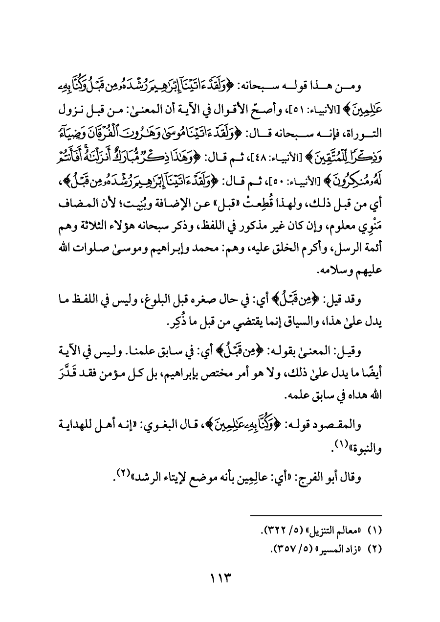 ومن هذا قوله سبحانه: {وَلَقَدْ آتَيْنَا إِبْرَاهِيمَ رُشْدَهُ مِنْ قَبْلُ وَكُنَّا بِهِ عَالِمِينَ} [الأنبياء: ٥١]، وأصحّ الأقوال في الآية أن المعنى: من قبل نزول التوراة، فإنه سبحانه قال: {وَلَقَدْ آتَيْنَا مُوسَى وَهَارُونَ الْفُرْقَانَ وَضِيَاءً وَذِكْرًا لِلْمُتَّقِينَ} [الأنبياء: ٤٨]، ثم قال: {وَهَذَا ذِكْرٌ مُبَارَكٌ أَنْزَلْنَاهُ أَفَأَنْتُمْ لَهُ مُنْكِرُونَ} [الأنبياء: ٥٠]، ثم قال: {وَلَقَدْ آتَيْنَا إِبْرَاهِيمَ رُشْدَهُ مِنْ قَبْلُ}، أي من قبل ذلك، ولهذا قُطِعتْ "قبل" عن الإضافة وبُنِيت؛ لأن المضاف مَنْوِي معلوم، وإن كان غير مذكور في اللفظ، وذكر سبحانه هؤلاء الثلاثة وهم أئمة الرسل، وأكرم الخلق عليه، وهم: محمد وإبراهيم وموسى صلوات الله عليهم وسلامه.