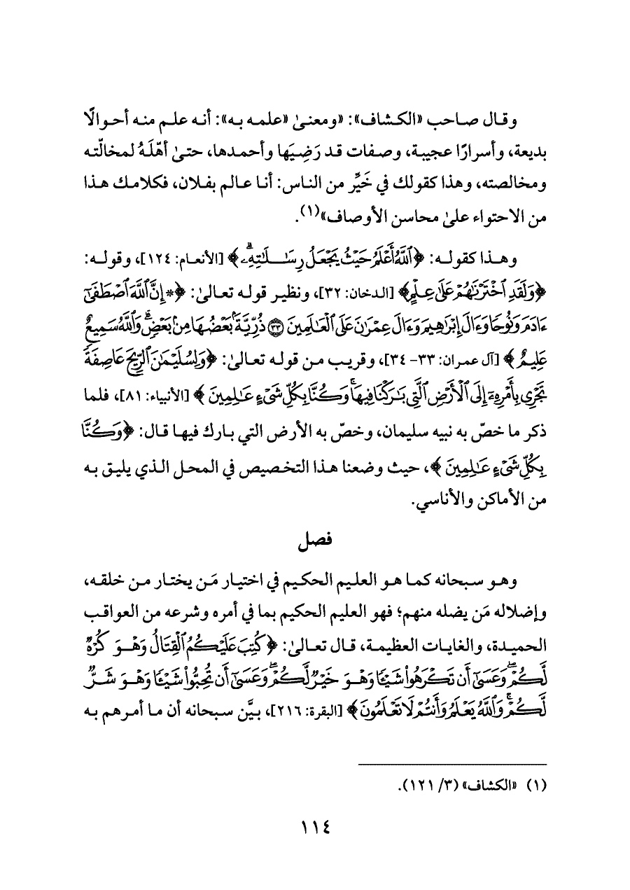 وهذا كقوله: {اللَّهُ أَعْلَمُ حَيْثُ يَجْعَلُ رِسَالَاتِهِ} [الأنعام: ١٢٤]، وقوله: {وَلَقَدِ اخْتَرْنَاهُمْ عَلَى عِلْمٍ} [الدخان: ٣٢]، ونظير قوله تعالى: {إِنَّ اللَّهَ اصْطَفَى آدَمَ وَنُوحًا وَآلَ إِبْرَاهِيمَ وَآلَ عِمْرَانَ عَلَى الْعَالَمِينَ (٣٣) ذُرِّيَّةً بَعْضُهَا مِنْ بَعْضٍ وَاللَّهُ سَمِيعٌ عَلِيمٌ} [آل عمران: ٣٣ - ٣٤]، وقريب من قوله تعالى: {وَلِسُلَيْمَانَ الرِّيحَ عَاصِفَةً تَجْرِي بِأَمْرِهِ إِلَى الْأَرْضِ الَّتِي بَارَكْنَا فِيهَا وَكُنَّا بِكُلِّ شَيْءٍ عَالِمِينَ} [الأنبياء: ٨١]، فلما ذكر ما خصّ به نبيه سليمان، وخصّ به الأرض التي بارك فيها قال: {وَكُنَّا بِكُلِّ شَيْءٍ عَالِمِينَ}، حيث وضعنا هذا التخصيص في المحل الذي يليق به من الأماكن والأناسي.