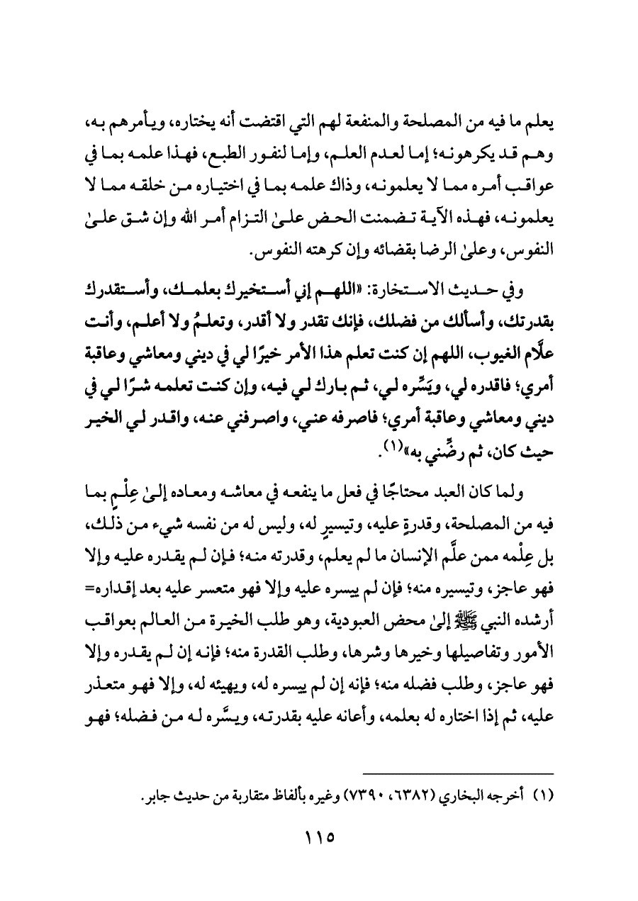ولما كان العبد محتاجًا في فعل ما ينفعه في معاشه ومعاده إلى عِلْمٍ بما فيه من المصلحة، وقدرةٍ عليه، وتيسيرٍ له، وليس له من نفسه شيء من ذلك، بل عِلْمه ممن علَّم الإنسان ما لم يعلم، وقدرته منه؛ فإن لم يقدره عليه وإلا فهو عاجز، وتيسيره منه؛ فإن لم ييسره عليه وإلا فهو متعسر عليه بعد إقداره= أرشده النبي - صلى الله عليه وسلم - إلى محض العبودية، وهو طلب الخيرة من العالم بعواقب الأمور وتفاصيلها وخيرها وشرها، وطلب القدرة منه؛ فإنه إن لم يقدره وإلا فهو عاجز، وطلب فضله منه؛ فإنه إن لم ييسره له، ويهيئه له، وإلا فهو متعذر عليه، ثم إذا اختاره له بعلمه، وأعانه عليه بقدرته، ويسَّره له من فضله؛ فهو