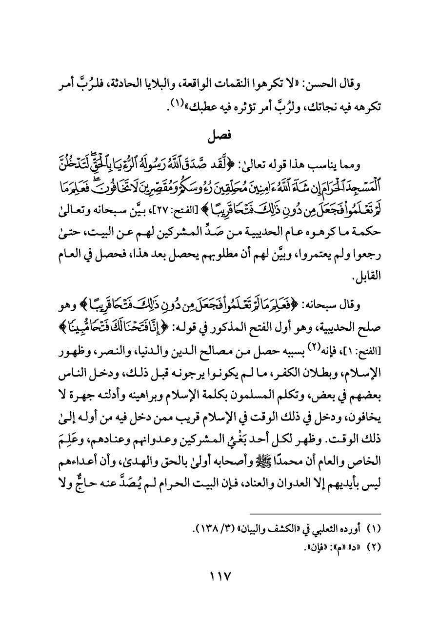 ومما يناسب هذا قوله تعالى: {لَّقَد صَّدَقَ اللَّهُ رَسُولَهُ الرُّؤْيَا بِالْحَقِّ لَتَدْخُلُنَّ الْمَسْجِدَ الْحَرَامَ إِنْ شَاءَ اللَّهُ آمِنِينَ مُحَلِّقِينَ رُءُوسَكُمْ وَمُقَصِّرِينَ لَا تَخَافُونَ فَعَلِمَ مَا لَمْ تَعْلَمُوا فَجَعَلَ مِنْ دُونِ ذَلِكَ فَتْحًا قَرِيبًا} [الفتح: ٢٧]، بيَّن سبحانه وتعالى حكمة ما كرهوه عام الحديبية من صَدِّ المشركين لهم عن البيت، حتى رجعوا ولم يعتمروا، وبيَّن لهم أن مطلوبهم يحصل بعد هذا، فحصل في العام القابل.
