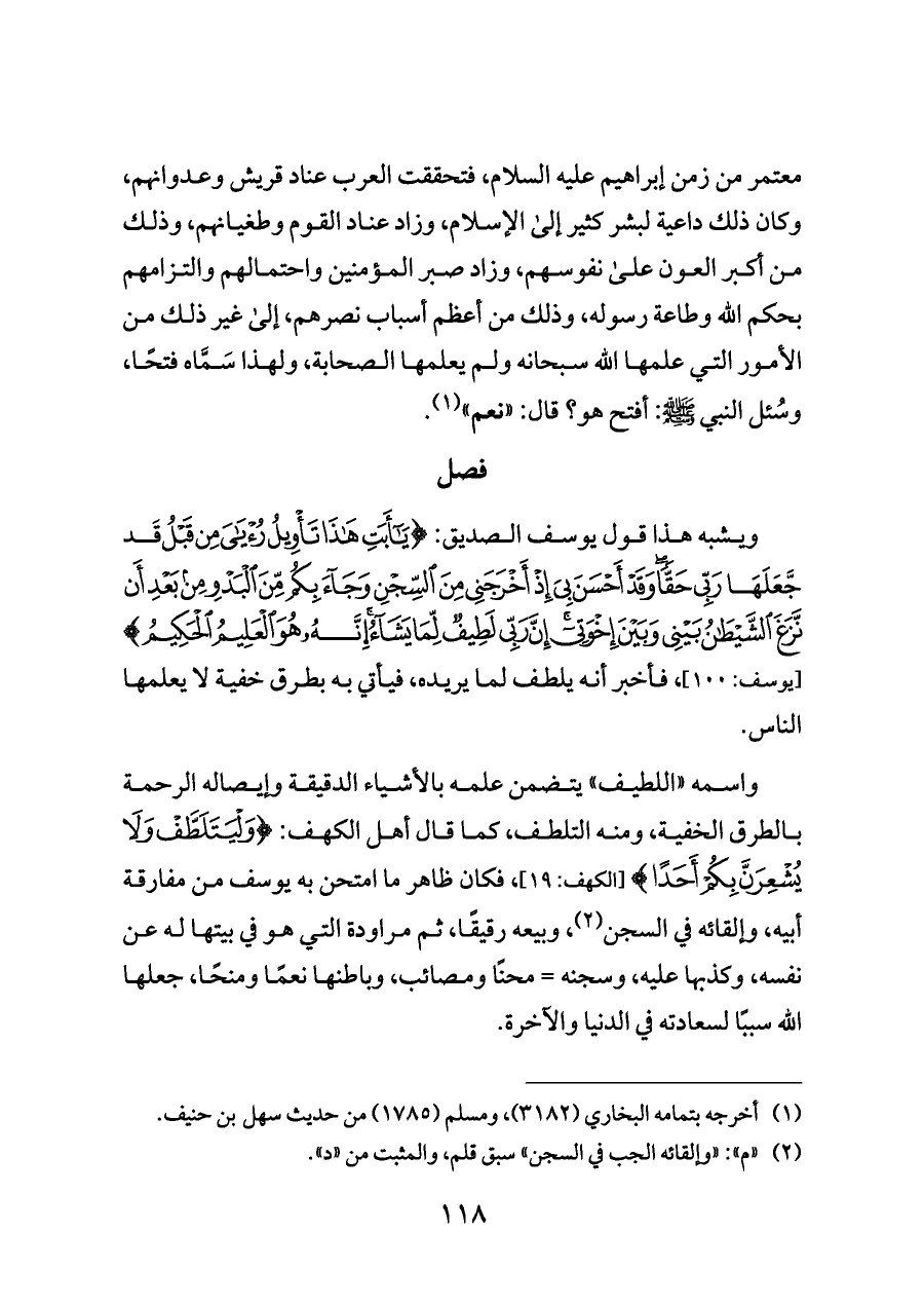 واسمه "اللطيف" يتضمن علمه بالأشياء الدقيقة وإيصاله الرحمة بالطرق الخفية، ومنه التلطف، كما قال أهل الكهف: {وَلْيَتَلَطَّفْ وَلَا يُشْعِرَنَّ بِكُمْ أَحَدًا} [الكهف: ١٩]، فكان ظاهر ما امتحن به يوسف من مفارقة أبيه، وإلقائه في السجن (¬٢)، وبيعه رقيقًا، ثم مراودة التي هو في بيتها له عن نفسه، وكذبها عليه، وسجنه = محنًا ومصائب، وباطنها نعمًا ومنحًا، جعلها الله سببًا لسعادته في الدنيا والآخرة.