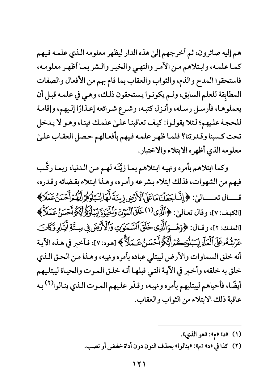 هم إليه صائرون، ثم أخرجهم إلى هذه الدار ليظهر معلومه الذي علمه فيهم كما علمه، وابتلاهم من الأمر والنهي والخير والشر بما أظهر معلومه، فاستحقوا المدح والذم، والثواب والعقاب بما قام بهم من الأفعال والصفات المطابِقة للعلم السابق، ولم يكونوا يستحقون ذلك، وهي في علمه قبل أن يعملوها، فأرسل رسله، وأنزل كتبه، وشرع شرائعه إعذارًا إليهم، وإقامة للحجة عليهم؛ لئلا يقولوا: كيف تعاقبنا على علمك فينا، وهو لا يدخل تحت كسبنا وقدرتنا؟ فلما ظهر علمه فيهم بأفعالهم حصل العقاب على معلومه الذي أظهره الابتلاء والاختبار.