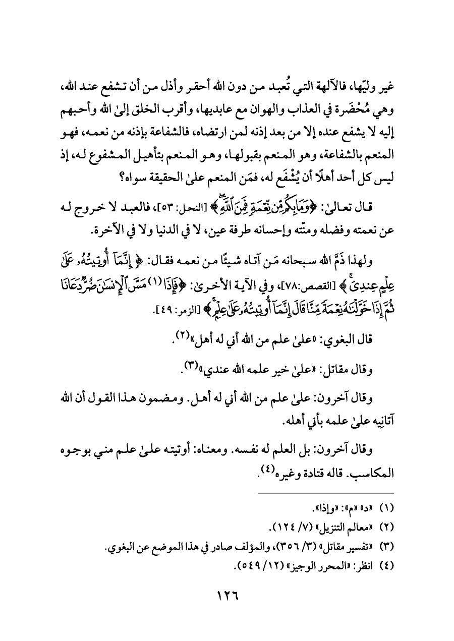 وقال آخرون: بل العلم له نفسه. ومعناه: أوتيته على علم مني بوجوه المكاسب. قاله قتادة وغيره (¬٤).
