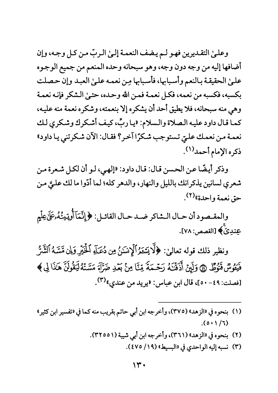 وذكر أيضًا عن الحسن قال: قال داود: "إلهي، لو أن لكل شعرة من شعري لسانين يذكرانك بالليل والنهار، والدهر كله؛ لما أدّوا ما لك عليَّ من حق نعمة واحدة" (¬٢).