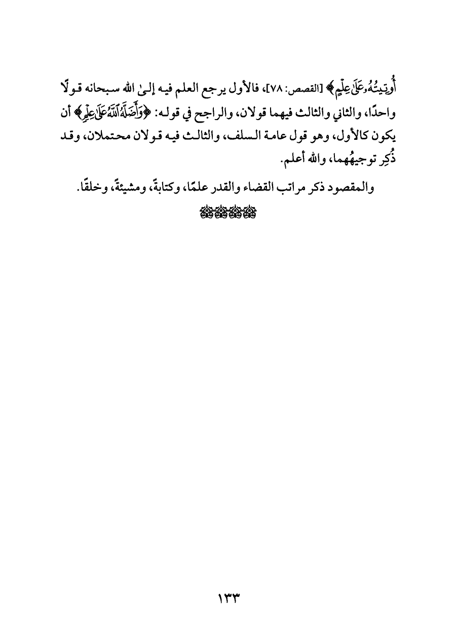 والمقصود ذكر مراتب القضاء والقدر علمًا، وكتابةً، ومشيئةً، وخلقًا.