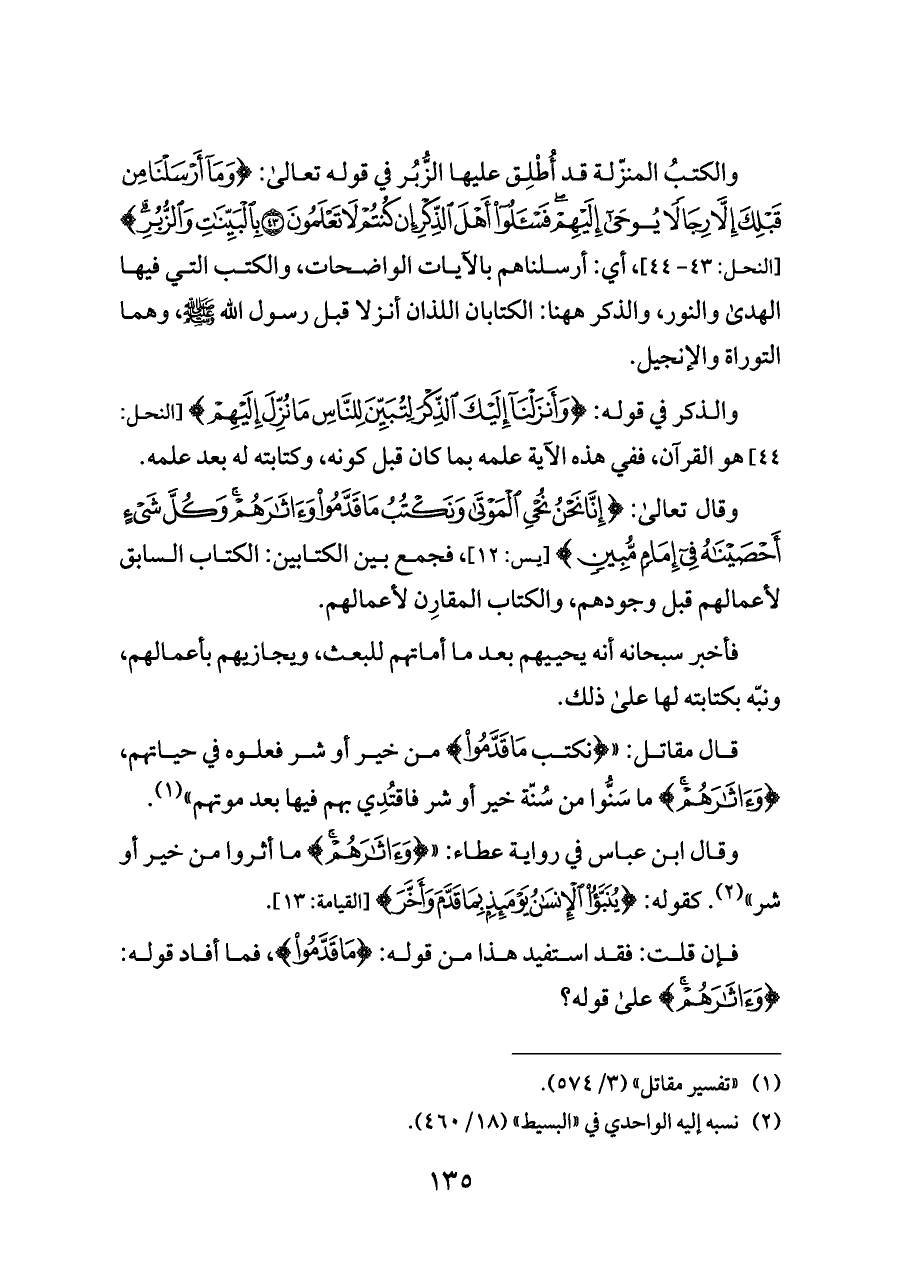 قال مقاتل: " {نكتب مَا قَدَّمُوا} من خير أو شر فعلوه في حياتهم، {وَآثَارَهُمْ} ما سَنُّوا من سُنّة خير أو شر فاقتُدِي بهم فيها بعد موتهم" (¬١).