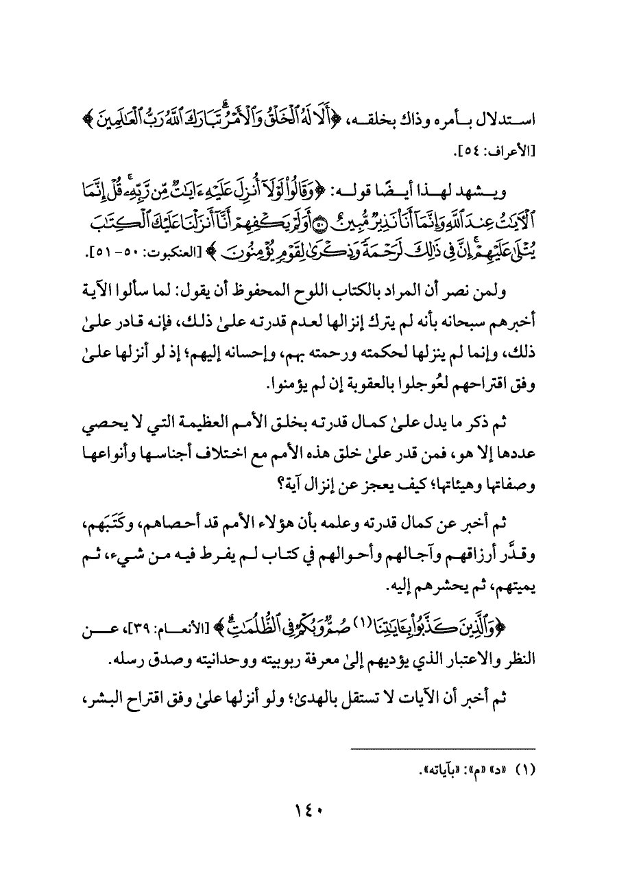 ولمن نصر أن المراد بالكتاب اللوح المحفوظ أن يقول: لما سألوا الآية أخبرهم سبحانه بأنه لم يترك إنزالها لعدم قدرته على ذلك، فإنه قادر على ذلك، وإنما لم ينزلها لحكمته ورحمته بهم، وإحسانه إليهم؛ إذ لو أنزلها على وفق اقتراحهم لعُوجلوا بالعقوبة إن لم يؤمنوا.