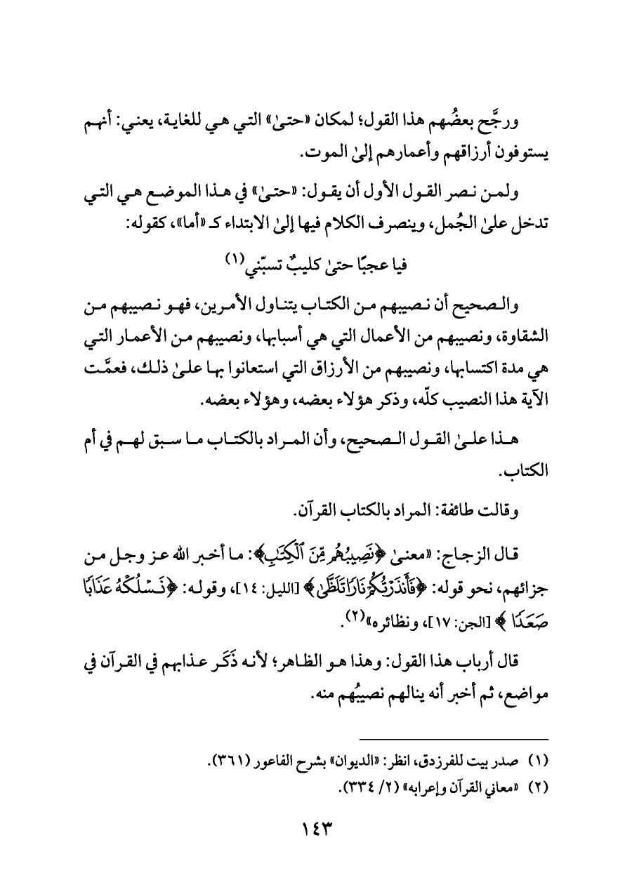 والصحيح أن نصيبهم من الكتاب يتناول الأمرين، فهو نصيبهم من الشقاوة، ونصيبهم من الأعمال التي هي أسبابها، ونصيبهم من الأعمار التي هي مدة اكتسابها، ونصيبهم من الأرزاق التي استعانوا بها على ذلك، فعمَّت الآية هذا النصيب كلّه، وذكر هؤلاء بعضه، وهؤلاء بعضه.