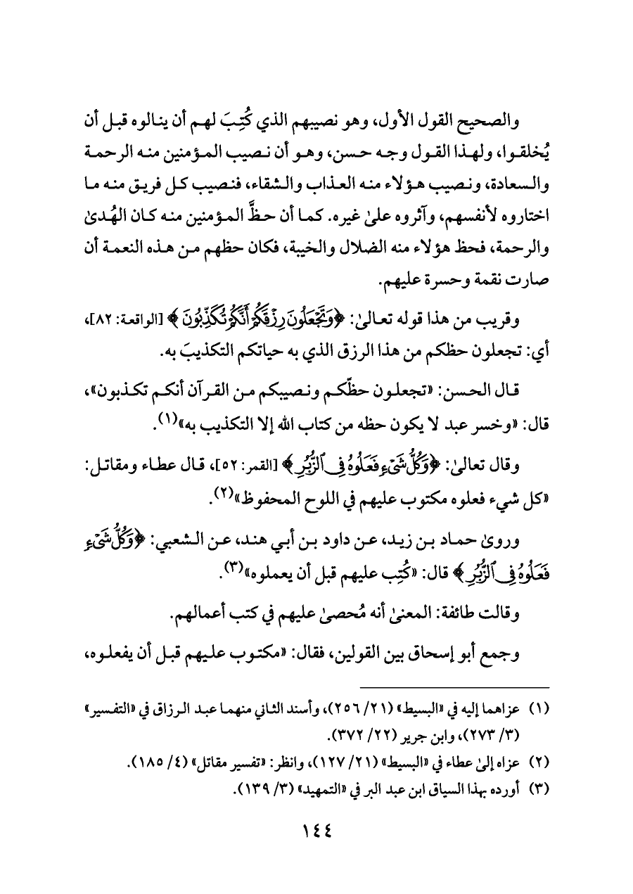 وروى حماد بن زيد، عن داود بن أبي هند، عن الشعبي: {وَكُلُّ شَيْءٍ فَعَلُوهُ فِي الزُّبُرِ} قال: "كُتِب عليهم قبل أن يعملوه" (¬٣).