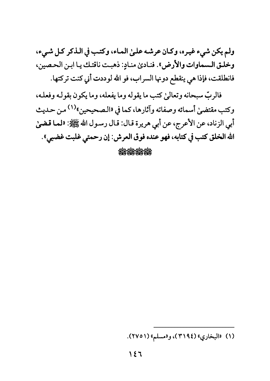 ولم يكن شيء غيره، وكان عرشه على الماء، وكتب في الذكر كل شيء، وخلق السماوات والأرض". فنادى منادٍ: ذهبت ناقتك يا ابن الحصين، فانطلقت، فإذا هي ينقطع دونها السراب، فو الله لوددت أني كنت تركتها.