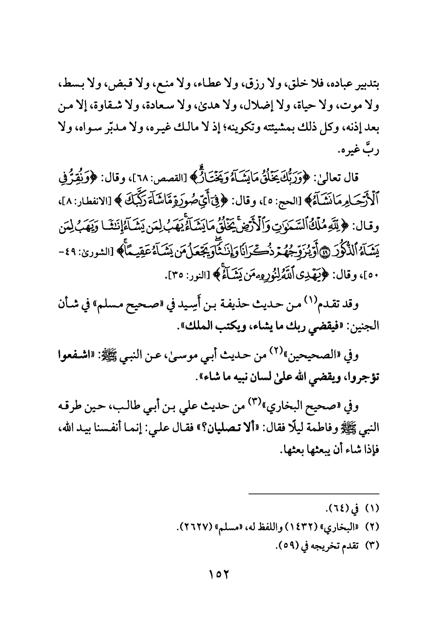 قال تعالى: {وَرَبُّكَ يَخْلُقُ مَا يَشَاءُ وَيَخْتَارُ} [القصص: ٦٨]، وقال: {وَنُقِرُّ فِي الْأَرْحَامِ مَا نَشَاءُ} [الحج: ٥]، وقال: {فِي أَيِّ صُورَةٍ مَا شَاءَ رَكَّبَكَ} [الانفطار: ٨]، وقال: {لِلَّهِ مُلْكُ السَّمَاوَاتِ وَالْأَرْضِ يَخْلُقُ مَا يَشَاءُ يَهَبُ لِمَنْ يَشَاءُ إِنَاثًا وَيَهَبُ لِمَنْ يَشَاءُ الذُّكُورَ (٤٩) أَوْ يُزَوِّجُهُمْ ذُكْرَانًا وَإِنَاثًا وَيَجْعَلُ مَنْ يَشَاءُ عَقِيمًا} [الشورى: ٤٩ - ٥٠]، وقال: {يَهْدِي اللَّهُ لِنُورِهِ مَنْ يَشَاءُ} [النور: ٣٥].