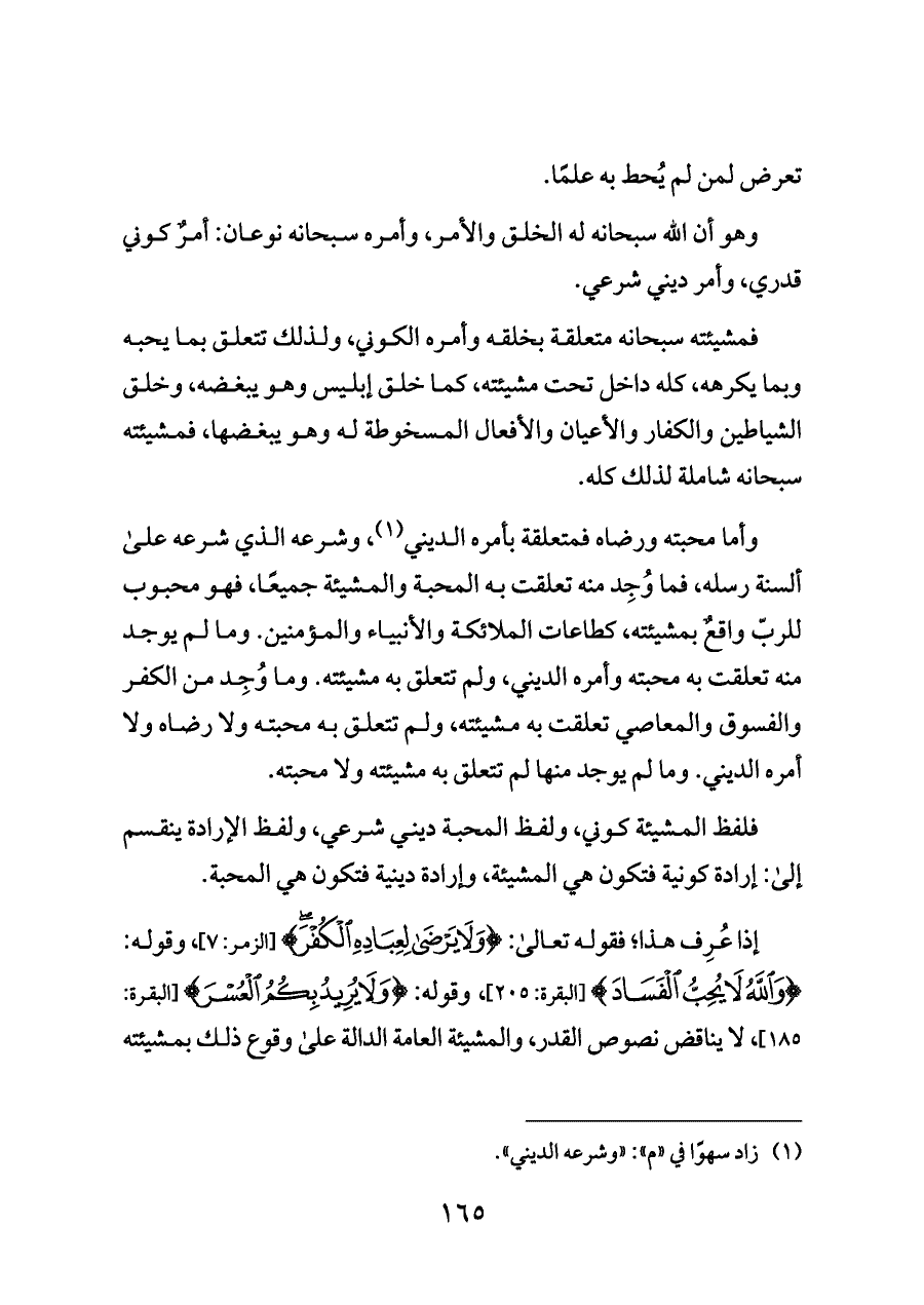 وأما محبته ورضاه فمتعلقة بأمره الديني (¬١)، وشرعه الذي شرعه على ألسنة رسله، فما وُجِد منه تعلقت به المحبة والمشيئة جميعًا، فهو محبوب للربّ واقعٌ بمشيئته، كطاعات الملائكة والأنبياء والمؤمنين. وما لم يوجد منه تعلقت به محبته وأمره الديني، ولم تتعلق به مشيئته. وما وُجِد من الكفر والفسوق والمعاصي تعلقت به مشيئته، ولم تتعلق به محبته ولا رضاه ولا أمره الديني. وما لم يوجد منها لم تتعلق به مشيئته ولا محبته.