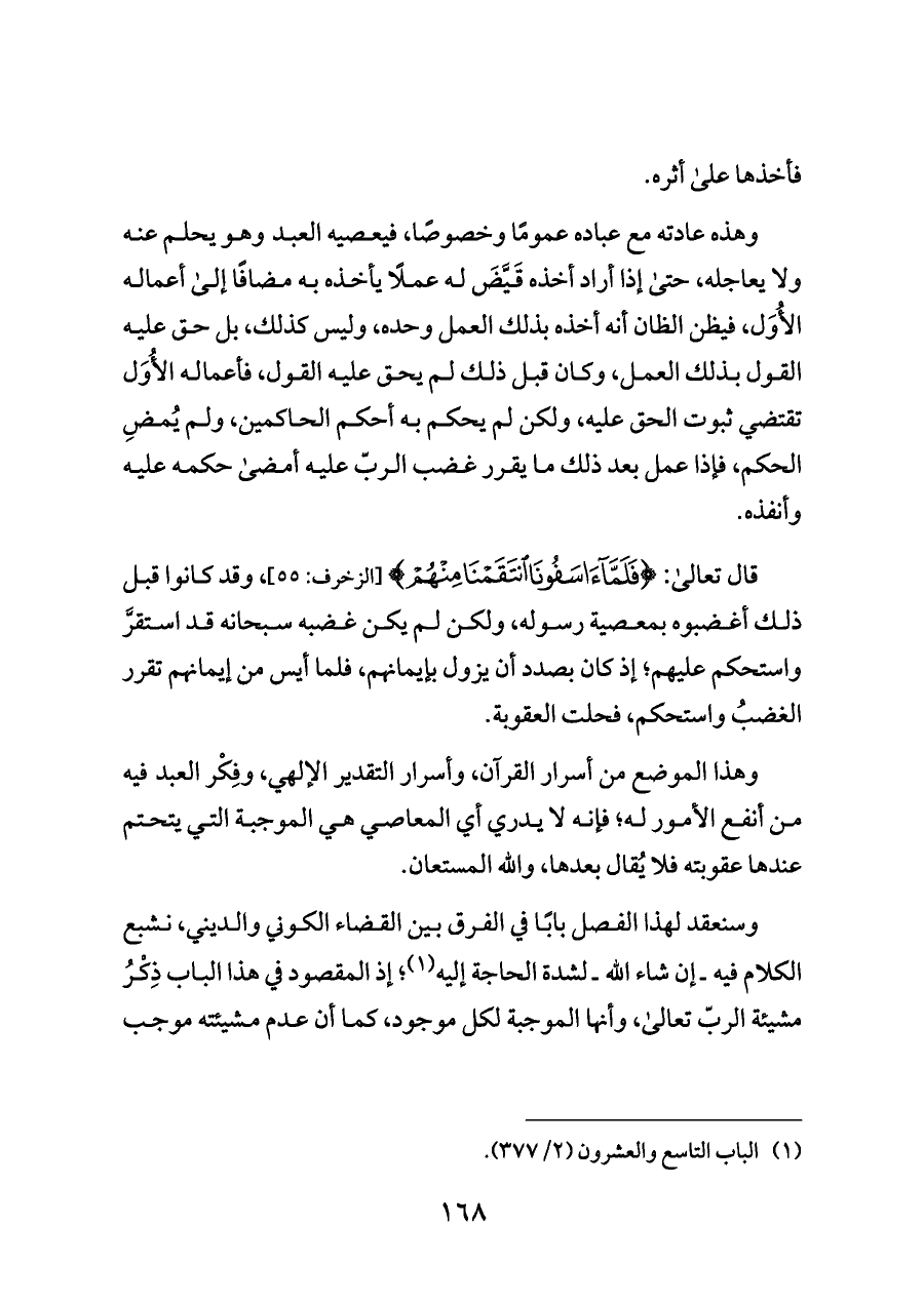 وسنعقد لهذا الفصل بابًا في الفرق بين القضاء الكوني والديني، نشبع الكلام فيه ـ إن شاء الله ـ لشدة الحاجة إليه (¬١)؛ إذ المقصود في هذا الباب ذِكْرُ مشيئة الربّ تعالى، وأنها الموجبة لكل موجود، كما أن عدم مشيئته موجب