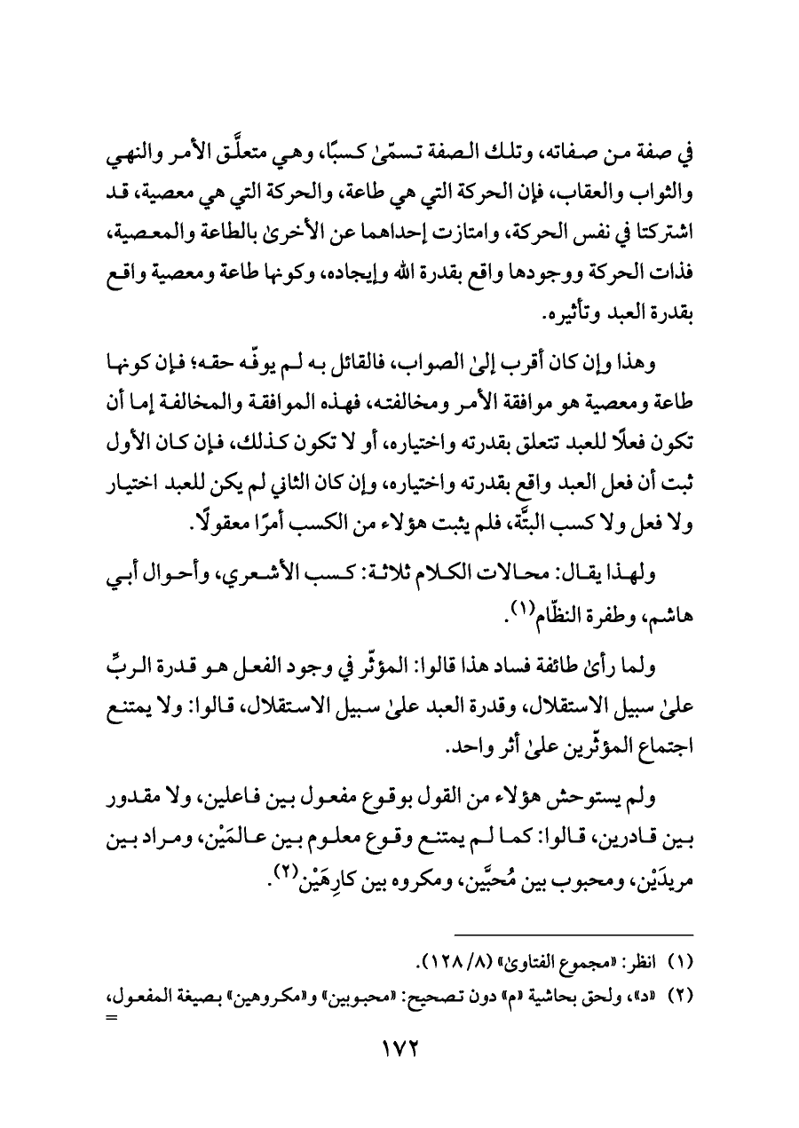 وهذا وإن كان أقرب إلى الصواب، فالقائل به لم يوفّه حقه؛ فإن كونها طاعة ومعصية هو موافقة الأمر ومخالفته، فهذه الموافقة والمخالفة إما أن تكون فعلًا للعبد تتعلق بقدرته واختياره، أو لا تكون كذلك، فإن كان الأول ثبت أن فعل العبد واقع بقدرته واختياره، وإن كان الثاني لم يكن للعبد اختيار ولا فعل ولا كسب البتَّة، فلم يثبت هؤلاء من الكسب أمرًا معقولًا.