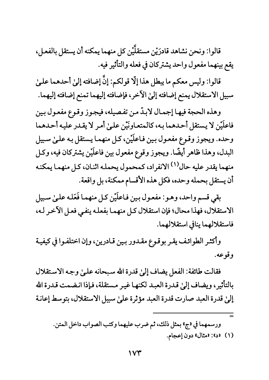 قالوا: ونحن نشاهد قادرَيْن مستقلَّيْن كل منهما يمكنه أن يستقل بالفعل، يقع بينهما مفعول واحد يشتركان في فعله والتأثير فيه.