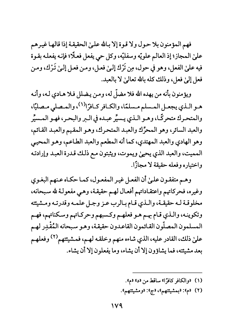 ويؤمنون بأنه من يهده الله فلا مضلّ له، ومن يضلل فلا هادي له، وأنه هو الذي يجعل المسلم مسلمًا، والكافر كافرًا (¬١)، والمصلي مصليًا، والمتحرك متحركًا، وهو الذي يسيِّر عبده في البر والبحر، فهو المسيِّر والعبد السائر، وهو المحرِّك والعبد المتحرك، وهو المقيم والعبد القائم، وهو الهادي والعبد المهتدي، كما أنه المطعم والعبد الطاعم، وهو المحيي المميت، والعبد الذي يحيى ويموت، ويثبتون مع ذلك قدرة العبد وإرادته واختياره وفعله حقيقة لا مجازًا.
