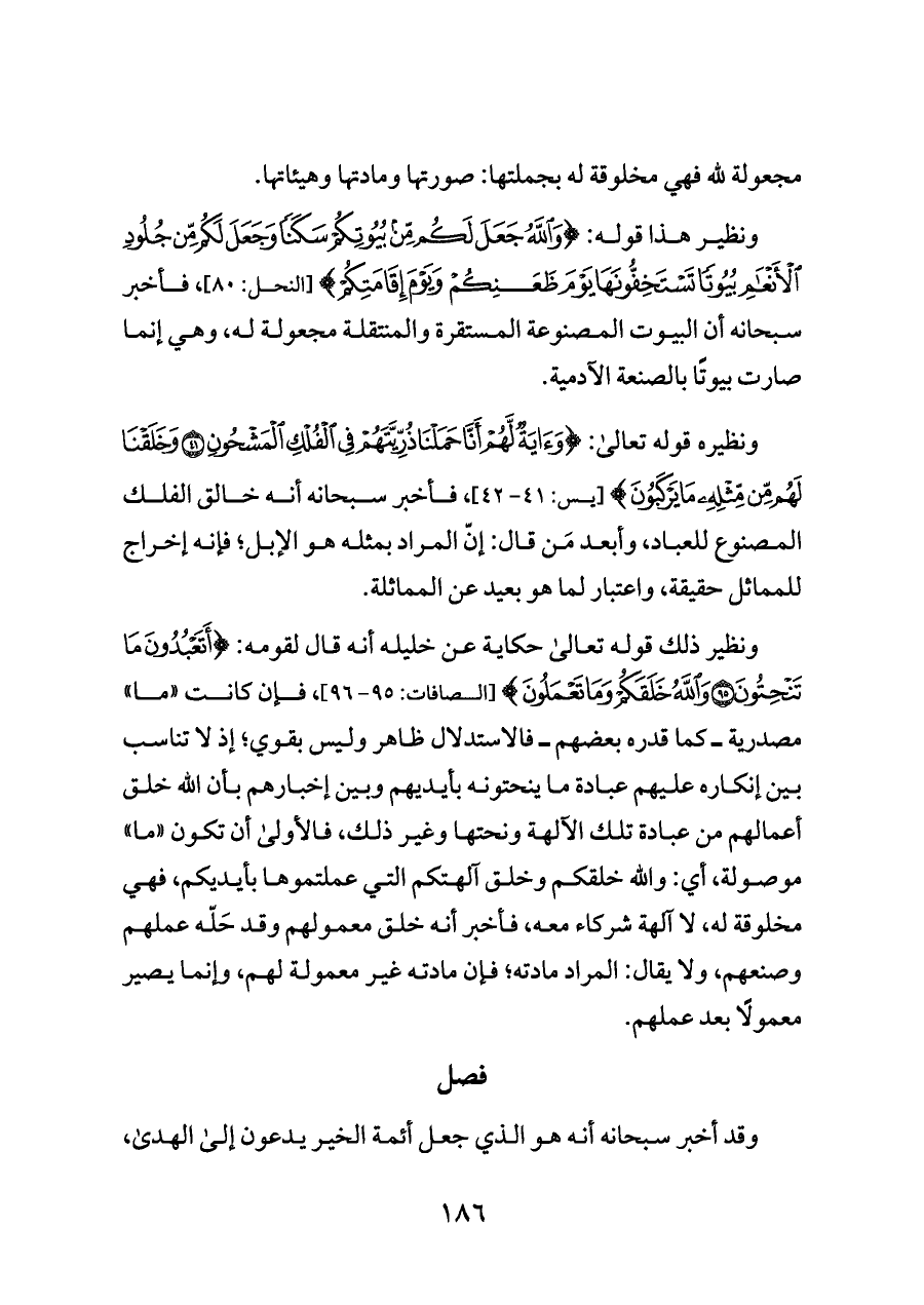 ونظير ذلك قوله تعالى حكاية عن خليله أنه قال لقومه: {أَتَعْبُدُونَ مَا تَنْحِتُونَ (٩٥) وَاللَّهُ خَلَقَكُمْ وَمَا تَعْمَلُونَ} [الصافات: ٩٥ - ٩٦]، فإن كانت "ما" مصدرية ــ كما قدره بعضهم ــ فالاستدلال ظاهر وليس بقوي؛ إذ لا تناسب بين إنكاره عليهم عبادة ما ينحتونه بأيديهم وبين إخبارهم بأن الله خلق أعمالهم من عبادة تلك الآلهة ونحتها وغير ذلك، فالأولى أن تكون "ما" موصولة، أي: والله خلقكم وخلق آلهتكم التي عملتموها بأيديكم، فهي مخلوقة له، لا آلهة شركاء معه، فأخبر أنه خلق معمولهم وقد حَلّه عملهم وصنعهم، ولا يقال: المراد مادته؛ فإن مادته غير معمولة لهم، وإنما يصير معمولًا بعد عملهم.