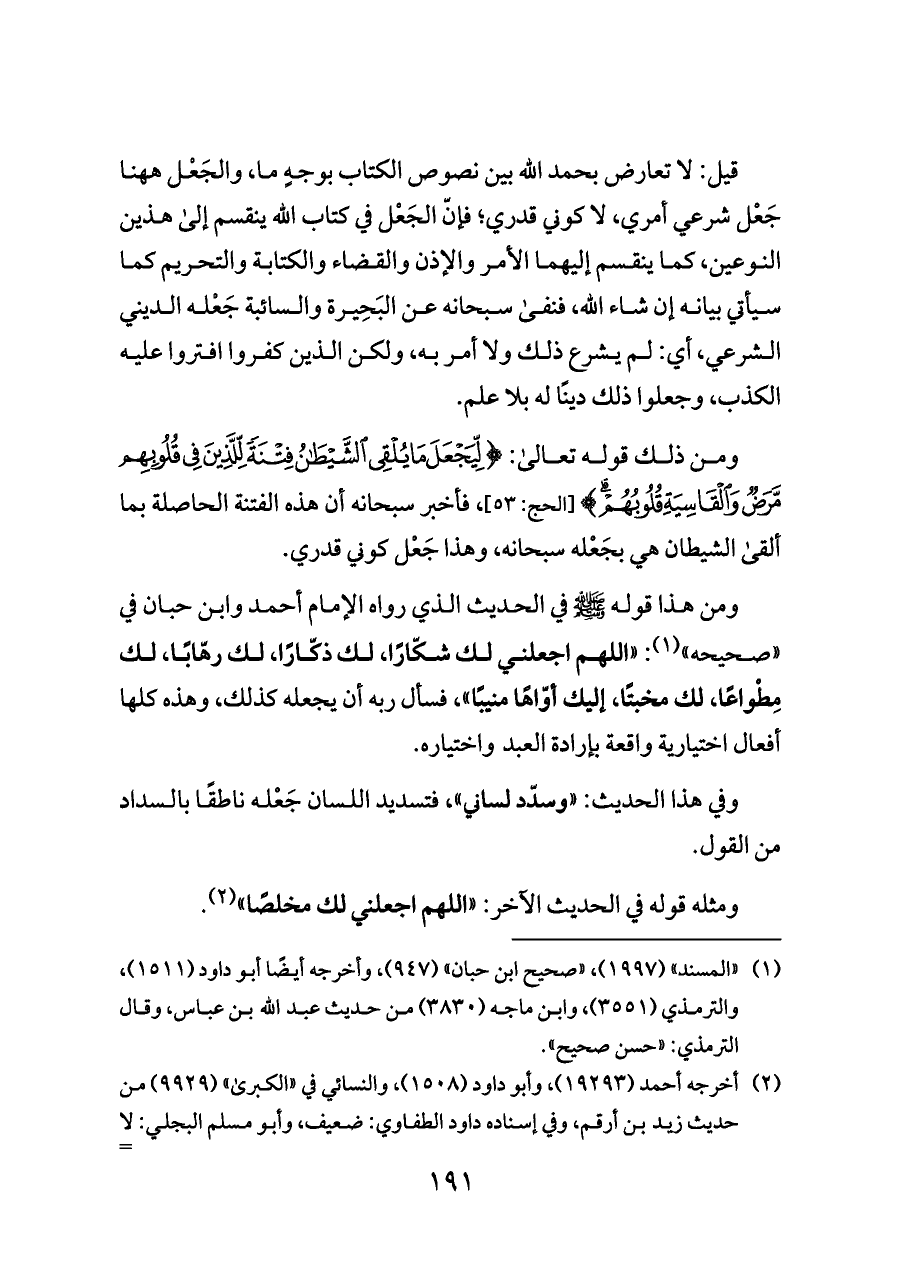 ومن ذلك قوله تعالى: {لِيَجْعَلَ مَا يُلْقِي الشَّيْطَانُ فِتْنَةً لِلَّذِينَ فِي قُلُوبِهِمْ مَرَضٌ وَالْقَاسِيَةِ قُلُوبُهُمْ} [الحج: ٥٣]، فأخبر سبحانه أن هذه الفتنة الحاصلة بما ألقى الشيطان هي بجَعْله سبحانه، وهذا جَعْل كوني قدري.