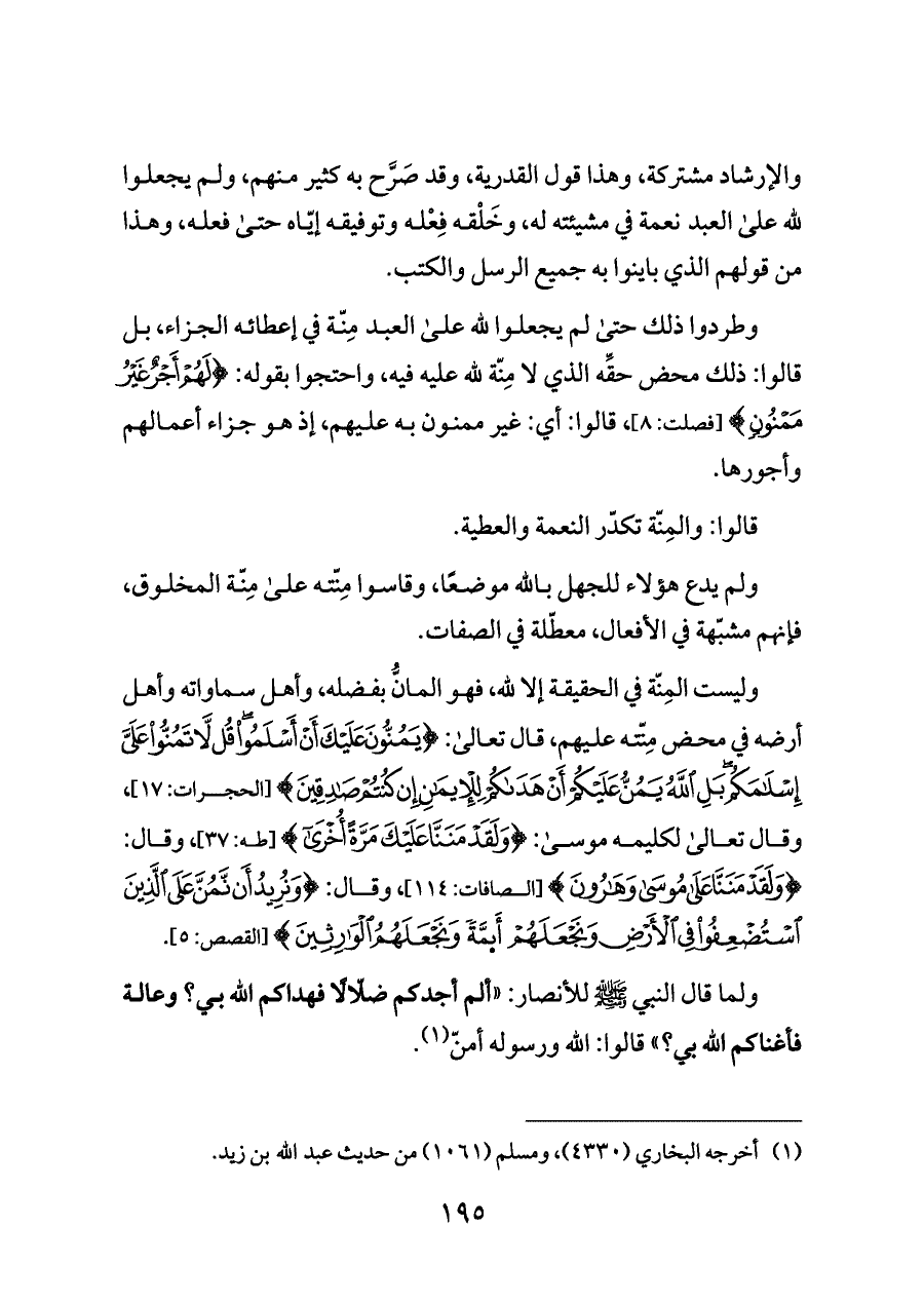 وطردوا ذلك حتى لم يجعلوا لله على العبد مِنّة في إعطائه الجزاء، بل قالوا: ذلك محض حقِّه الذي لا مِنّة لله عليه فيه، واحتجوا بقوله: {لَهُمْ أَجْرٌ غَيْرُ مَمْنُونٍ} [فصلت: ٨]، قالوا: أي: غير ممنون به عليهم، إذ هو جزاء أعمالهم وأجورها.