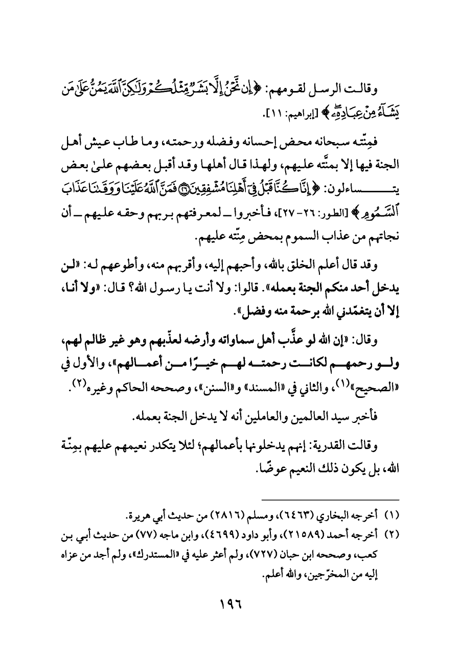 وقالت القدرية: إنهم يدخلونها بأعمالهم؛ لئلا يتكدر نعيمهم عليهم بمِنّة الله، بل يكون ذلك النعيم عوضًا.