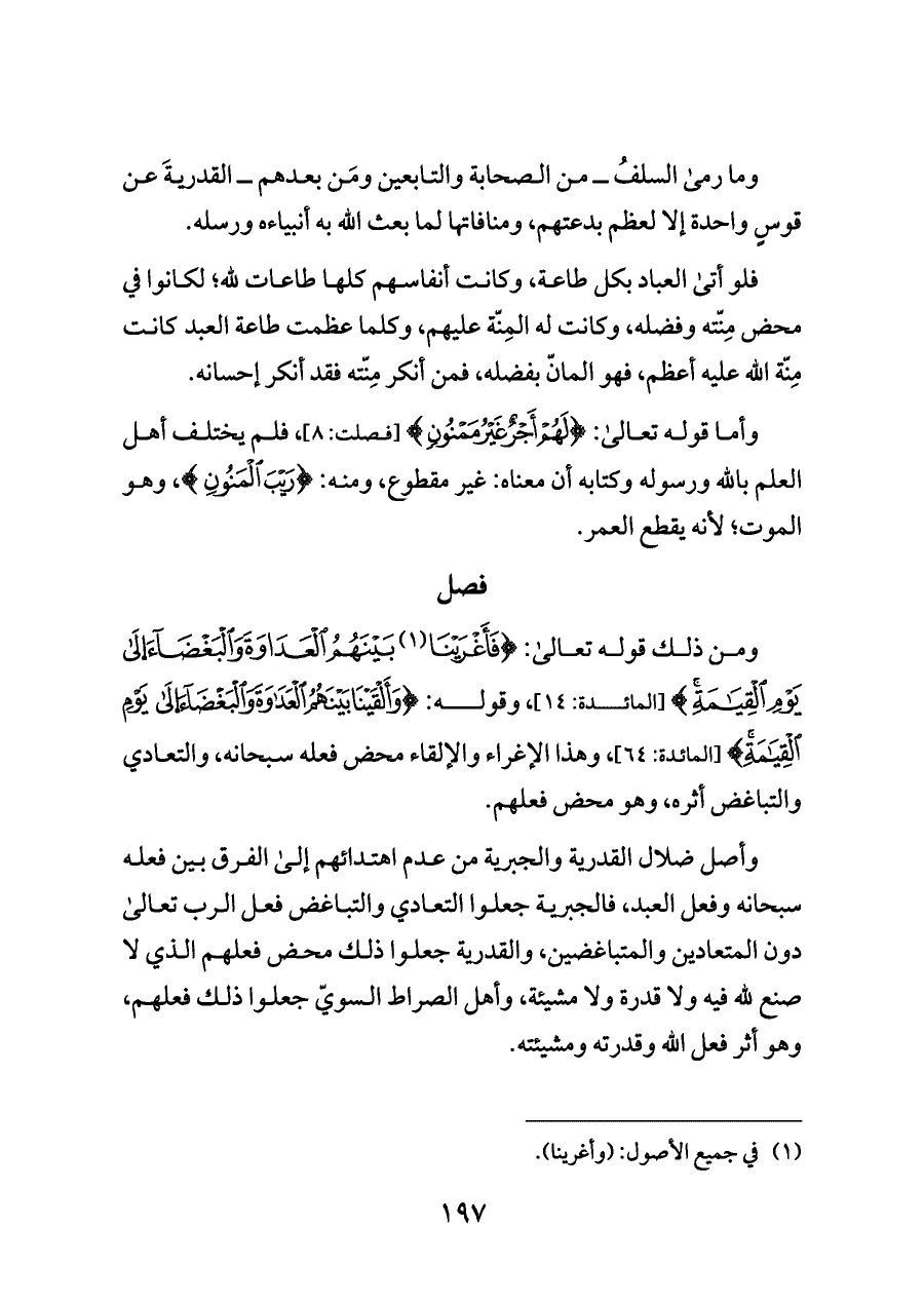 وأصل ضلال القدرية والجبرية من عدم اهتدائهم إلى الفرق بين فعله سبحانه وفعل العبد، فالجبرية جعلوا التعادي والتباغض فعل الرب تعالى دون المتعادين والمتباغضين، والقدرية جعلوا ذلك محض فعلهم الذي لا صنع لله فيه ولا قدرة ولا مشيئة، وأهل الصراط السويّ جعلوا ذلك فعلهم، وهو أثر فعل الله وقدرته ومشيئته.