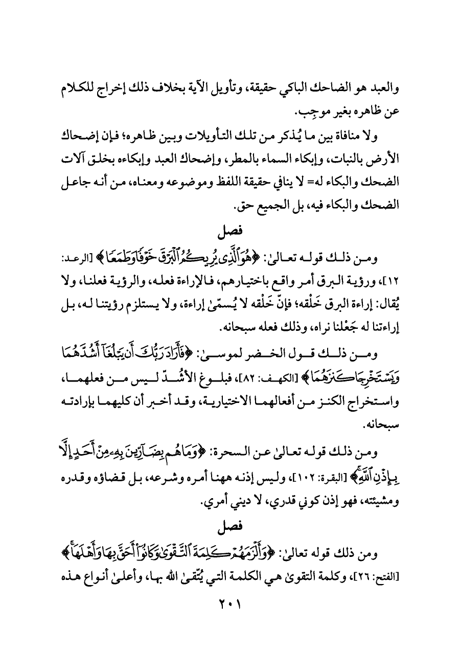 ومن ذلك قوله تعالى: {هُوَ الَّذِي يُرِيكُمُ الْبَرْقَ خَوْفًا وَطَمَعًا} [الرعد: ١٢]، ورؤية البرق أمر واقع باختيارهم، فالإراءة فعله، والرؤية فعلنا، ولا يُقال: إراءة البرق خَلْقه؛ فإنّ خَلْقه لا يُسمّى إراءة، ولا يستلزم رؤيتنا له، بل إراءتنا له جَعْلنا نراه، وذلك فعله سبحانه.