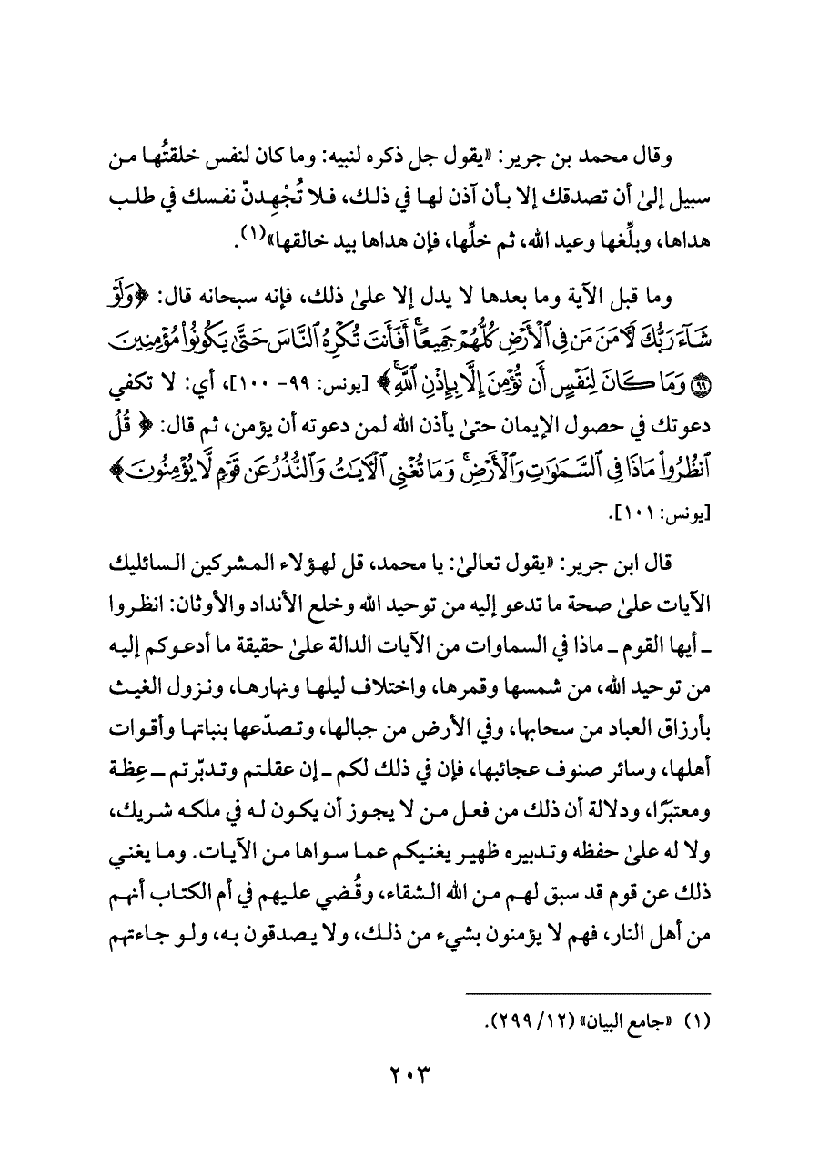 وقال محمد بن جرير: "يقول جل ذكره لنبيه: وما كان لنفس خلقتُها من سبيل إلى أن تصدقك إلا بأن آذن لها في ذلك، فلا تُجْهِدنّ نفسك في طلب هداها، وبلِّغها وعيد الله، ثم خلِّها، فإن هداها بيد خالقها" (¬١).