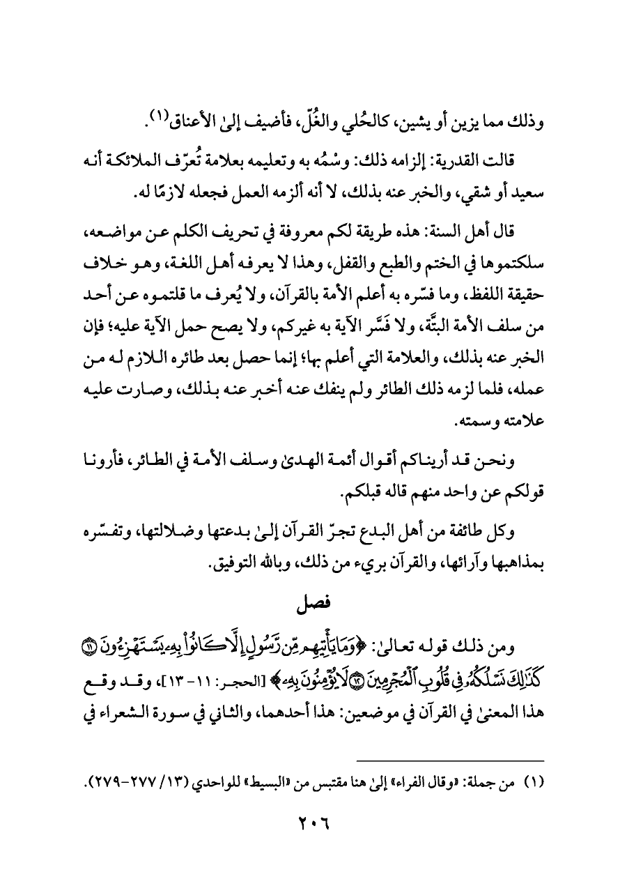 قال أهل السنة: هذه طريقة لكم معروفة في تحريف الكلم عن مواضعه، سلكتموها في الختم والطبع والقفل، وهذا لا يعرفه أهل اللغة، وهو خلاف حقيقة اللفظ، وما فسّره به أعلم الأمة بالقرآن، ولا يُعرف ما قلتموه عن أحد من سلف الأمة البتَّة، ولا فَسَّر الآية به غيركم، ولا يصح حمل الآية عليه؛ فإن الخبر عنه بذلك، والعلامة التي أعلم بها؛ إنما حصل بعد طائره اللازم له من عمله، فلما لزمه ذلك الطائر ولم ينفك عنه أخبر عنه بذلك، وصارت عليه علامته وسمته.