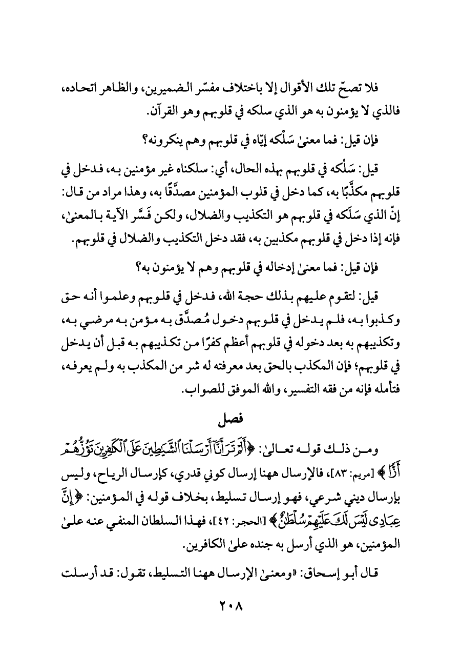 ومن ذلك قوله تعالى: {أَلَمْ تَرَ أَنَّا أَرْسَلْنَا الشَّيَاطِينَ عَلَى الْكَافِرِينَ تَؤُزُّهُمْ أَزًّا} [مريم: ٨٣]، فالإرسال ههنا إرسال كوني قدري، كإرسال الرياح، وليس بإرسال ديني شرعي، فهو إرسال تسليط، بخلاف قوله في المؤمنين: {إِنَّ عِبَادِي لَيْسَ لَكَ عَلَيْهِمْ سُلْطَانٌ} [الحجر: ٤٢]، فهذا السلطان المنفي عنه على المؤمنين، هو الذي أرسل به جنده على الكافرين.