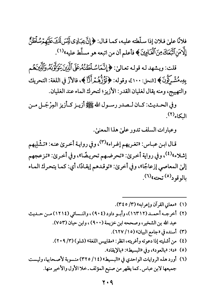 قال ابن عباس: "تغريهم إغراء" (¬٣)، وفي رواية أخرى عنه: "تشْلِيهم إشلاء" (¬٤)، وفي رواية أخرى: "تحرضهم تحريضًا"، وفي أخرى: "تزعجهم إلى المعاصي إزعاجًا"، وفي أخرى: "توقدهم إيقادًا، أي: كما يتحرك الماء بالوقود (¬٥) تحته" (¬٦).