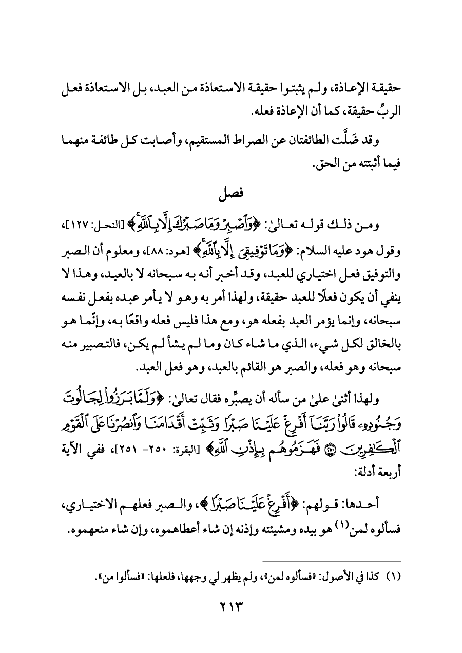 ومن ذلك قوله تعالى: {(١٢٦) وَاصْبِرْ وَمَا صَبْرُكَ إِلَّا بِاللَّهِ} [النحل: ١٢٧]، وقول هود عليه السلام: {وَمَا تَوْفِيقِيَ إِلَّا بِاللَّهِ} [هود: ٨٨]، ومعلوم أن الصبر والتوفيق فعل اختياري للعبد، وقد أخبر أنه به سبحانه لا بالعبد، وهذا لا ينفي أن يكون فعلًا للعبد حقيقة، ولهذا أمر به وهو لا يأمر عبده بفعل نفسه سبحانه، وإنما يؤمر العبد بفعله هو، ومع هذا فليس فعله واقعًا به، وإنّما هو بالخالق لكل شيء، الذي ما شاء كان وما لم يشأ لم يكن، فالتصبير منه سبحانه وهو فعله، والصبر هو القائم بالعبد، وهو فعل العبد.