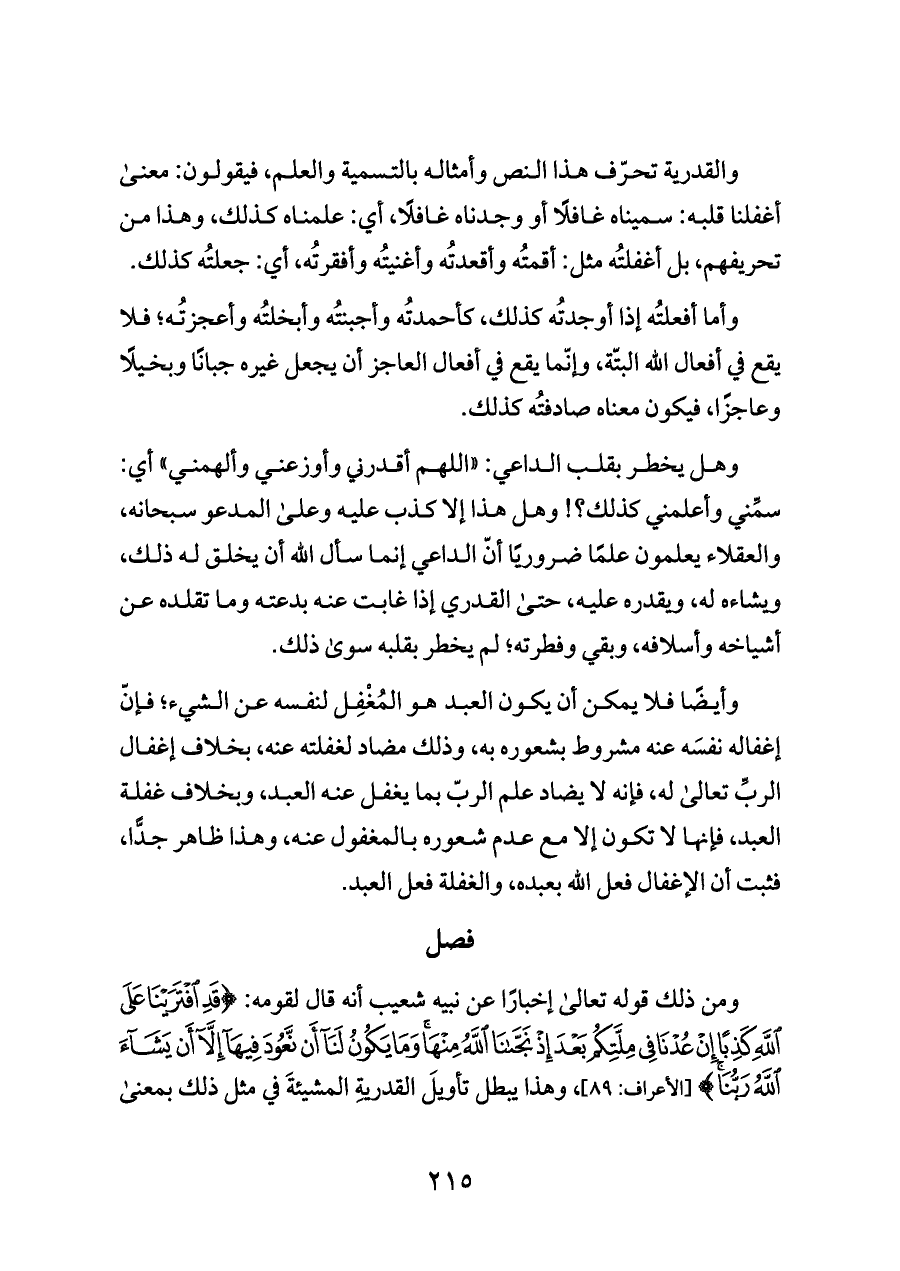 والقدرية تحرّف هذا النص وأمثاله بالتسمية والعلم، فيقولون: معنى أغفلنا قلبه: سميناه غافلًا أو وجدناه غافلًا، أي: علمناه كذلك، وهذا من تحريفهم، بل أغفلتُه مثل: أقمتُه وأقعدتُه وأغنيتُه وأفقرتُه، أي: جعلتُه كذلك.