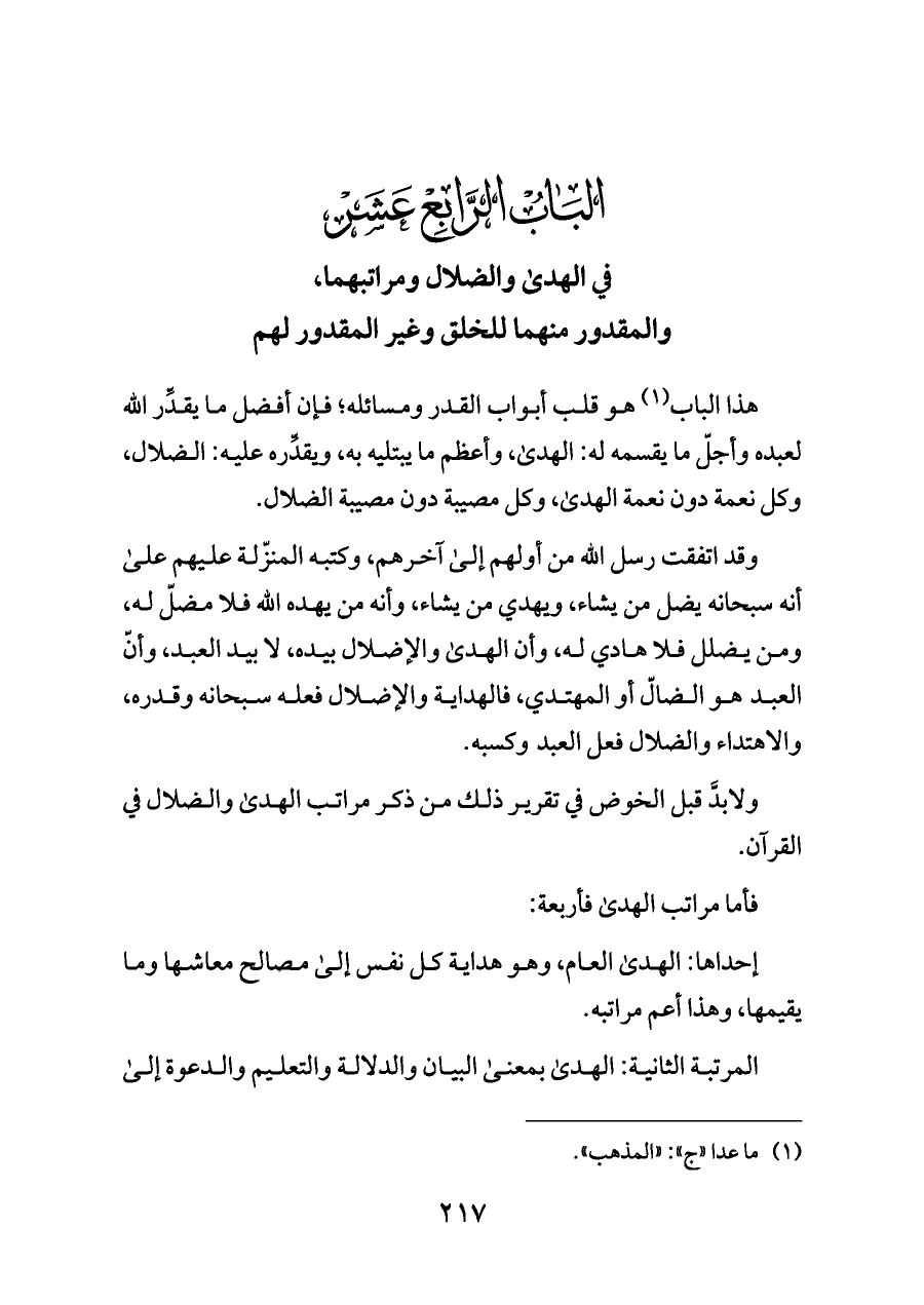 هذا الباب (¬١) هو قلب أبواب القدر ومسائله؛ فإن أفضل ما يقدِّر الله لعبده وأجلّ ما يقسمه له: الهدى، وأعظم ما يبتليه به، ويقدِّره عليه: الضلال، وكل نعمة دون نعمة الهدى، وكل مصيبة دون مصيبة الضلال.