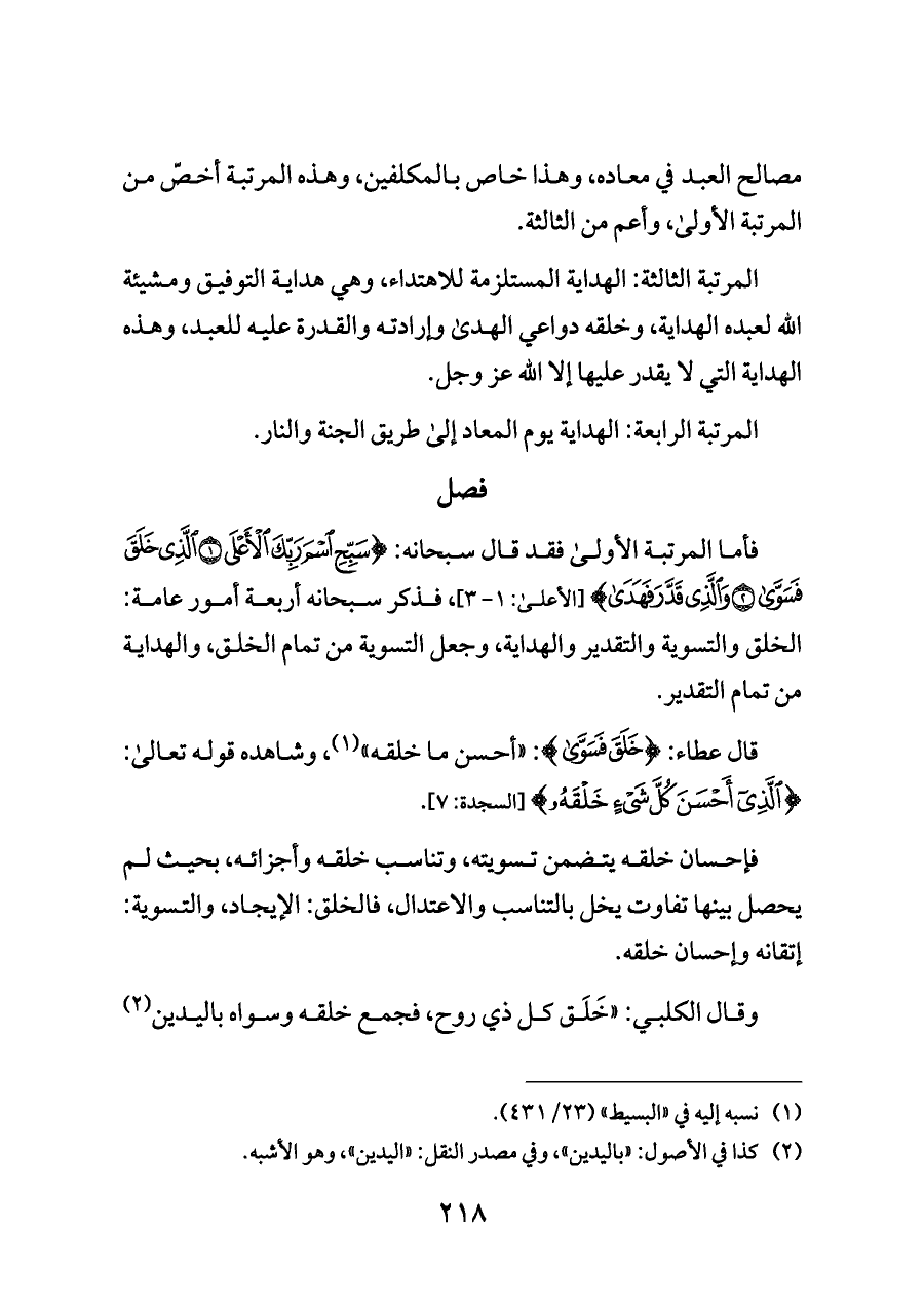 فأما المرتبة الأولى فقد قال سبحانه: {سَبِّحِ اسْمَ رَبِّكَ الْأَعْلَى (١) الَّذِي خَلَقَ فَسَوَّى (٢) وَالَّذِي قَدَّرَ فَهَدَى} [الأعلى: ١ - ٣]، فذكر سبحانه أربعة أمور عامة: الخلق والتسوية والتقدير والهداية، وجعل التسوية من تمام الخلق، والهداية من تمام التقدير.